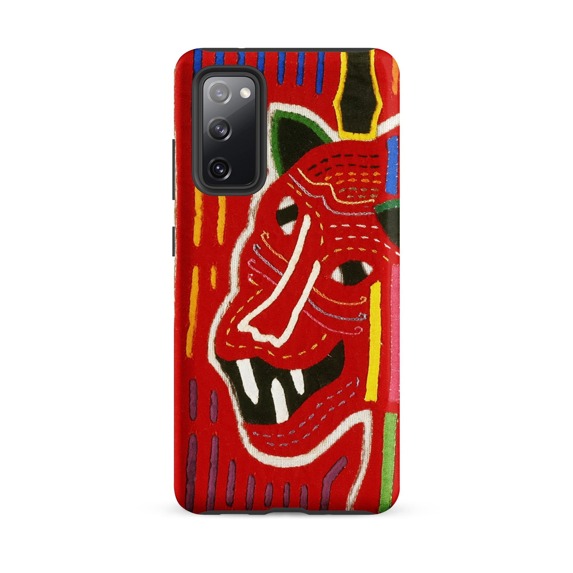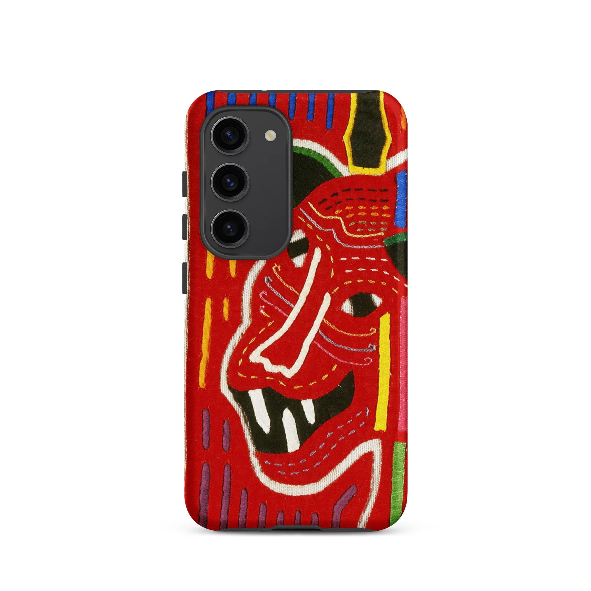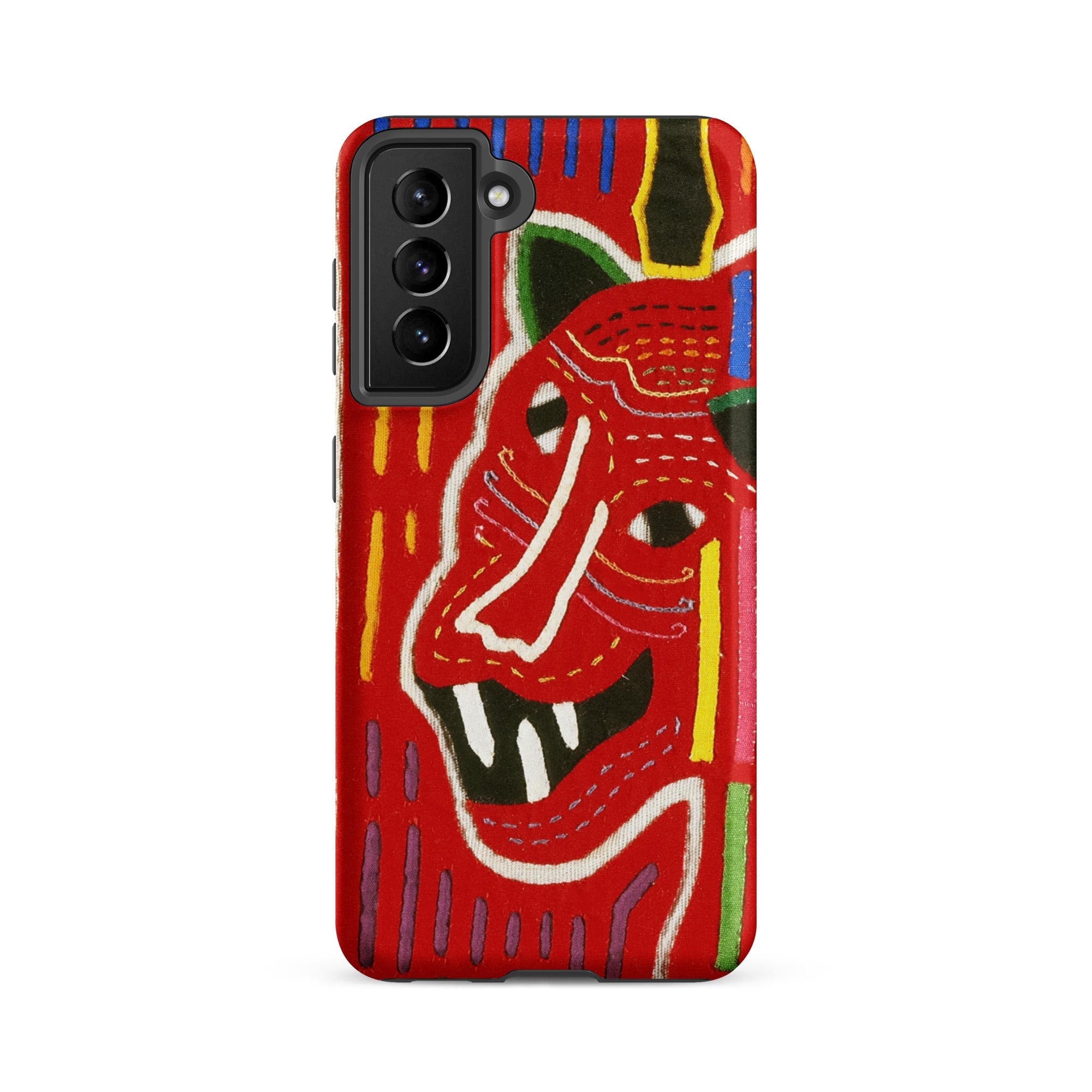 Cada contorno—destello amarillo, trazo violeta, arco esmeralda—sigue las capas cortadas a mano del bordado tradicional Mola, nacido en las Islas San Blas de Panamá. Esta funda protectora de Samsung lleva ese lenguaje textil centenario al presente eléctrico, su patrón vibrando con el espíritu animal ceremonial, el dosel de la jungla costera y la vitalidad de las máscaras de festival.