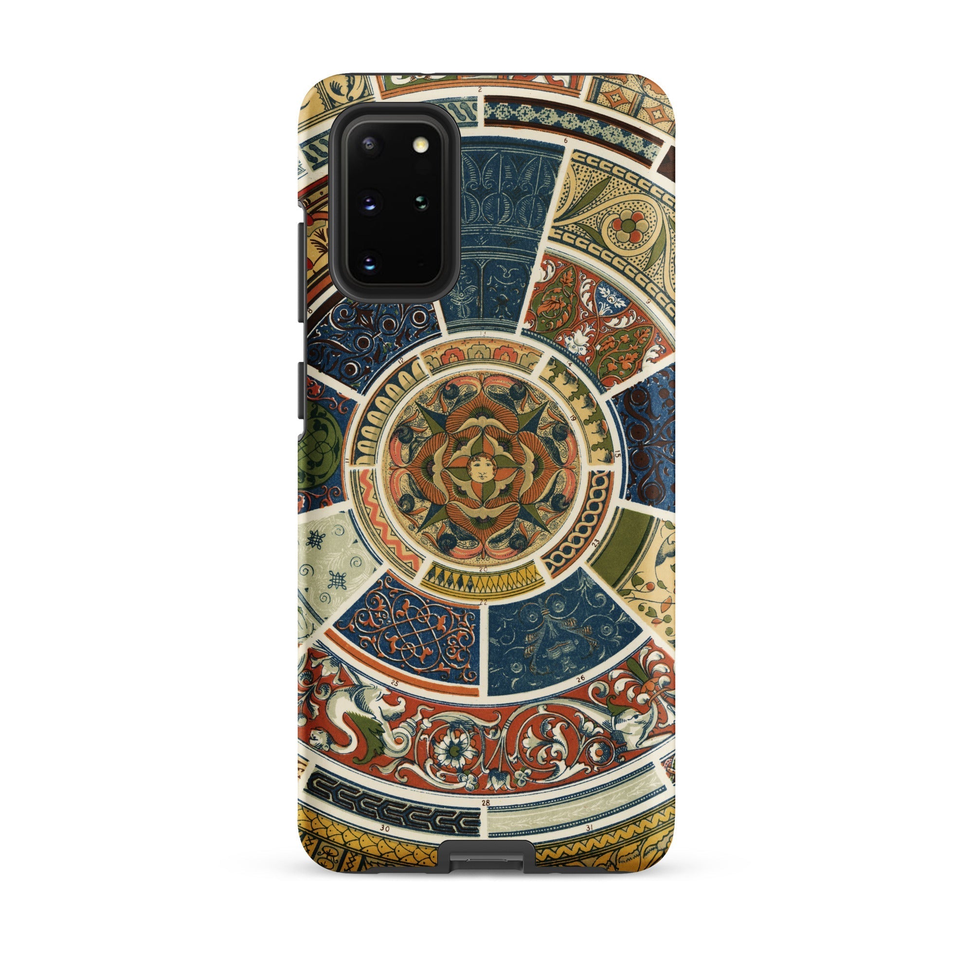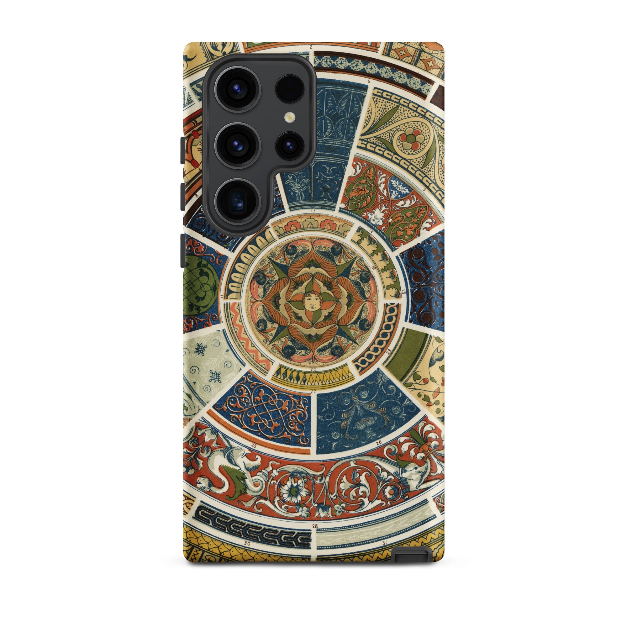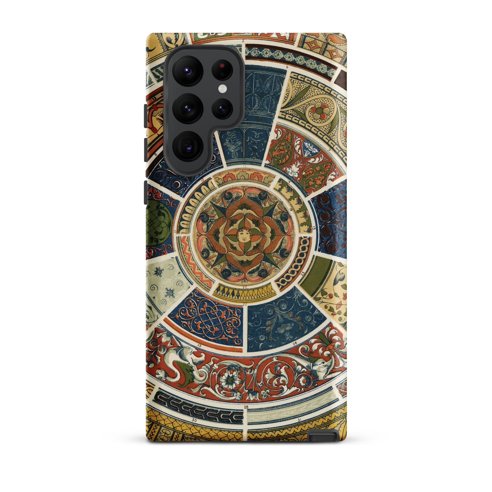 La cara del sol cromolitográfica de Owen Jones brilla dentro de un halo arabesco. Radiando desde la columna vertebral de este estuche Samsung, sus frondas rizadas se encuentran con bandas de azul persa, verde musgo y trabajo de pergamino carmesí.