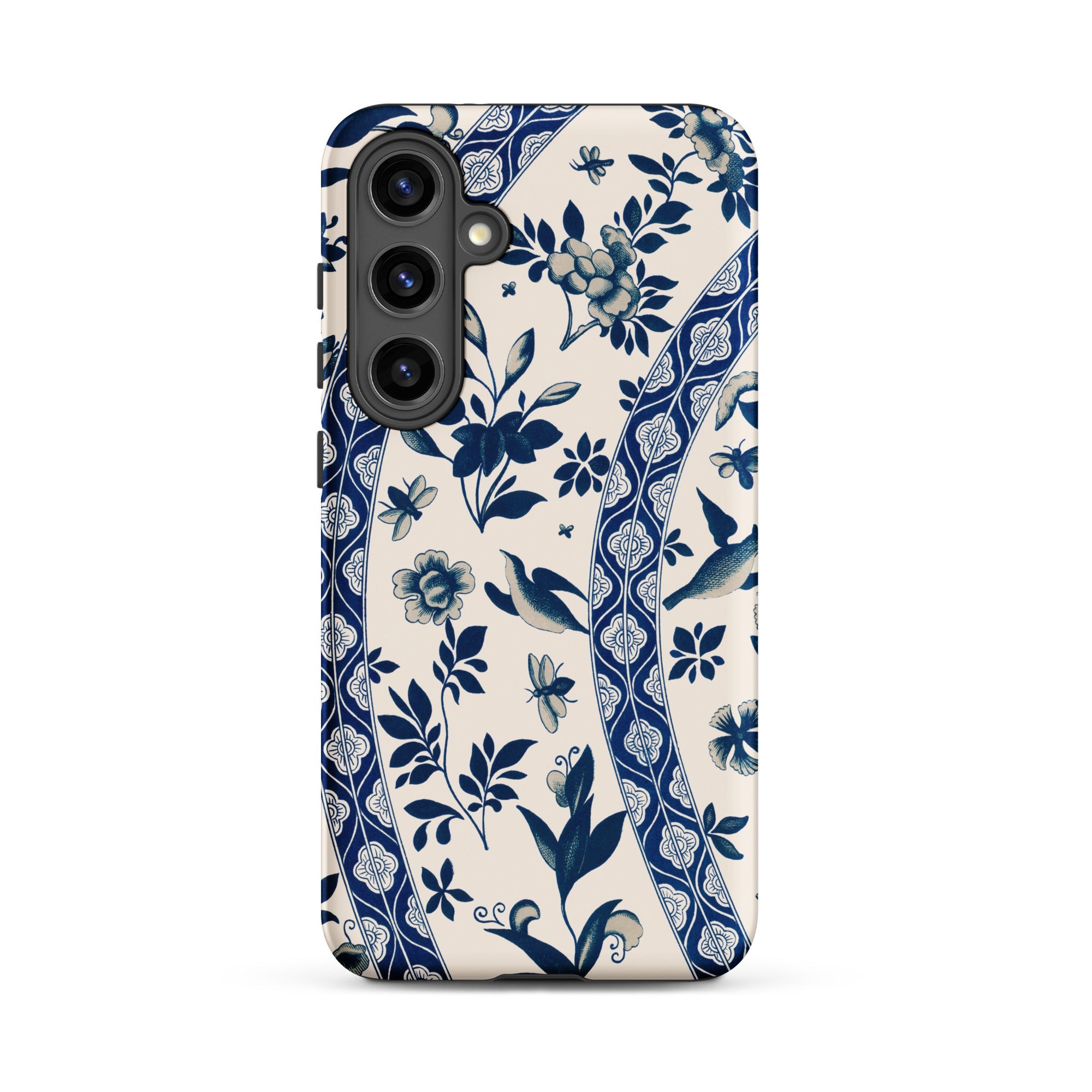 Este estuche contiene tanto historia como fantasía en su entramado de flora y vuelo, envolviendo tu Samsung en una página de un léxico ornamental que unió Oriente y Occidente con tinta azul e invención sin límites.