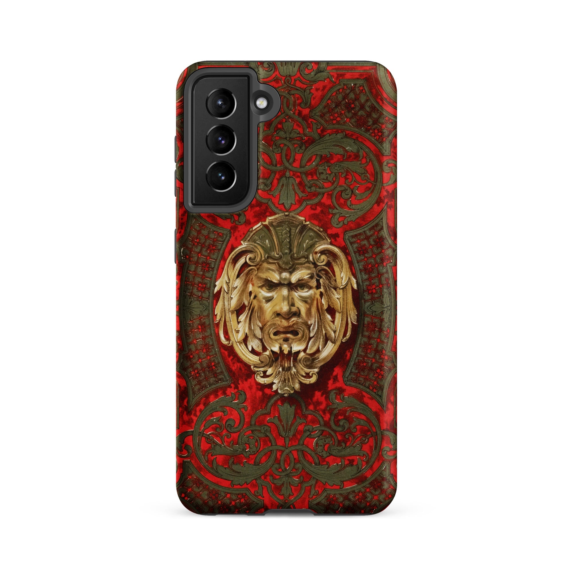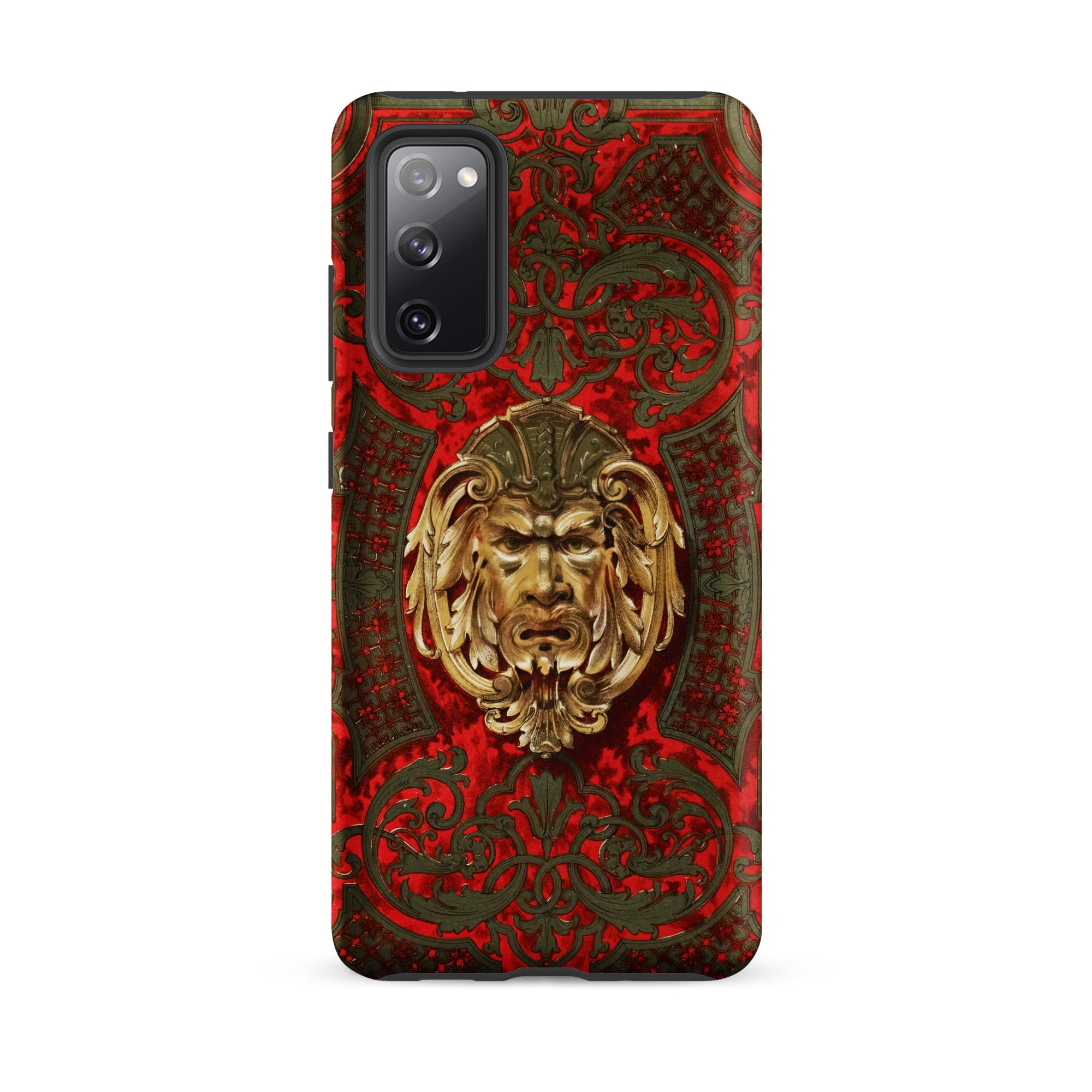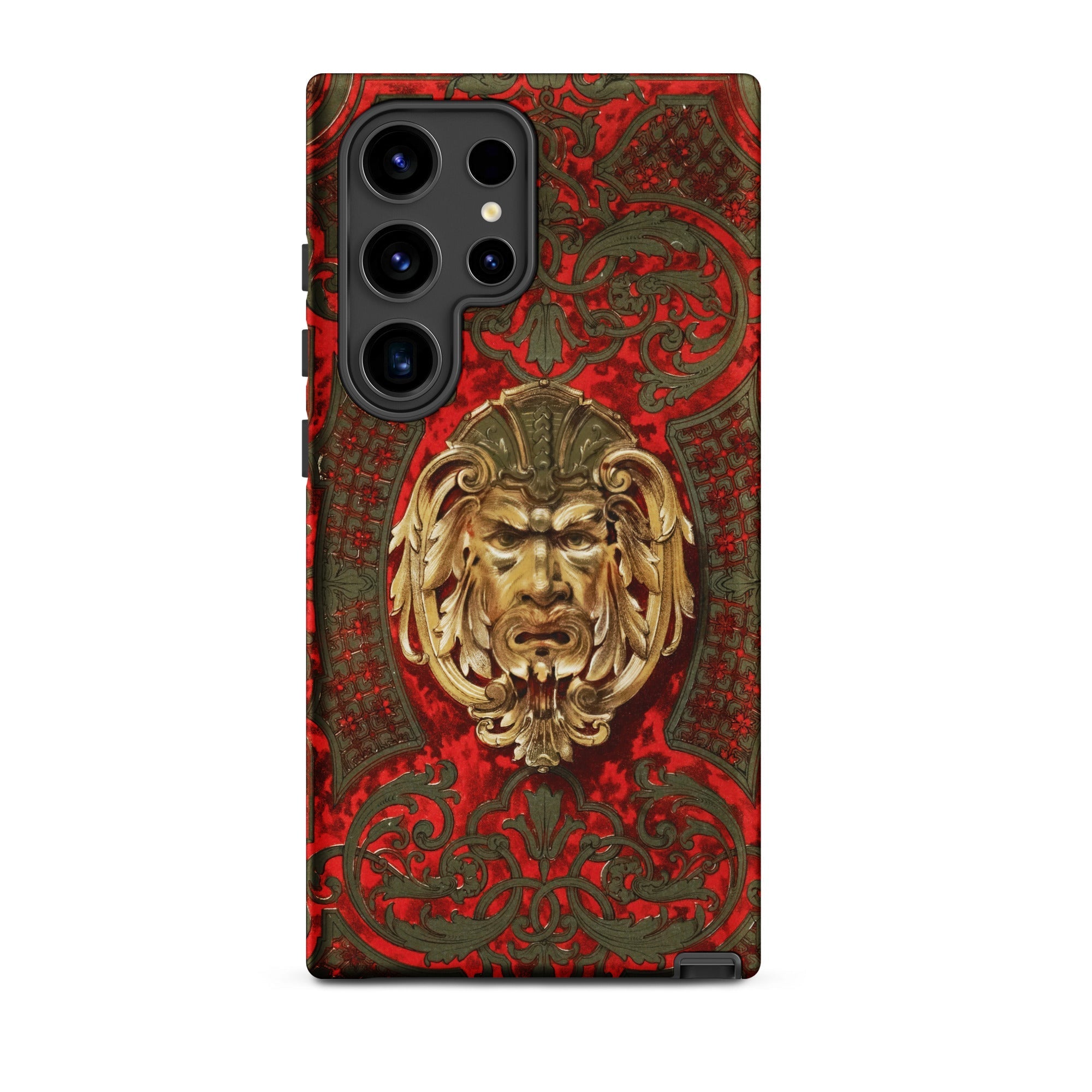 Un guardián bruñido mira desde la parte trasera del teléfono, su ceño leonino cargado con siglos. Fundido en relieve dorado, el rostro emerge de un campo carmesí vivo con acanto enroscado, celosía de enrejado y zarcillos de follaje curvados.