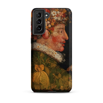 La obra refleja la fascinación de la Europa del siglo XVI por catalogar la flora y celebrar los ciclos del mundo natural. Las flores se derraman en una cabeza adornada con guirnaldas, mientras las hojas de lechuga y un cítrico se hinchan en el pecho. Instalado en esta funda de Samsung, el retrato lleva el ingenio renacentista al siglo XXI, espectáculo botánico hecho móvil.