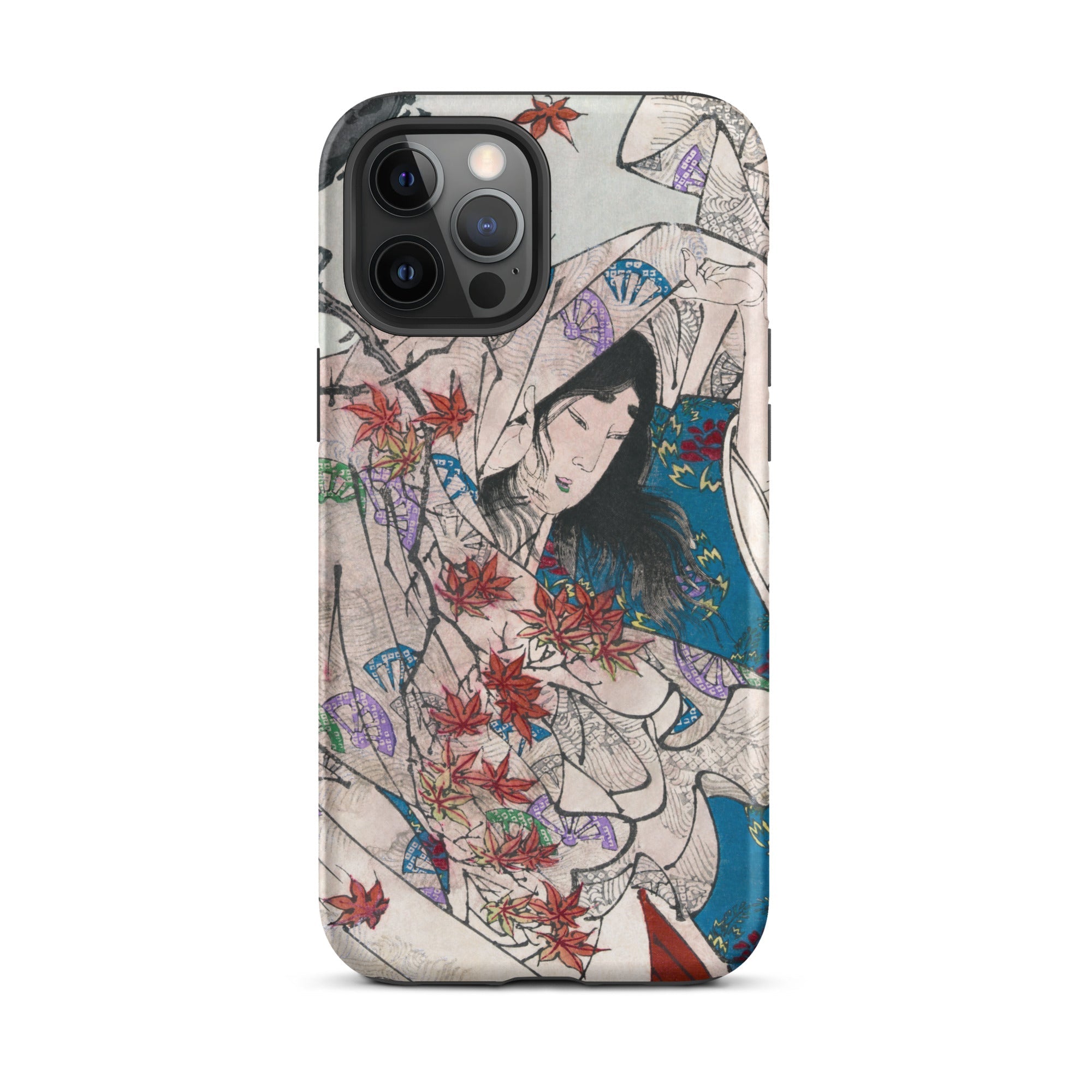 Este sueño ukiyo-e de Taiso Yoshitoshi—enredado con arce otoñal y abanicos ceremoniales—florece en tu iPhone como un susurro de la poesía de la corte Heian. Ahora este ensueño del período Edo se convierte en armadura: efímera, elegante, bordeada de mito. Protegiendo tu dispositivo dentro de una temporada de quietud, donde el flujo del tiempo se ralentiza por la tela pintada y la sombra lacada.