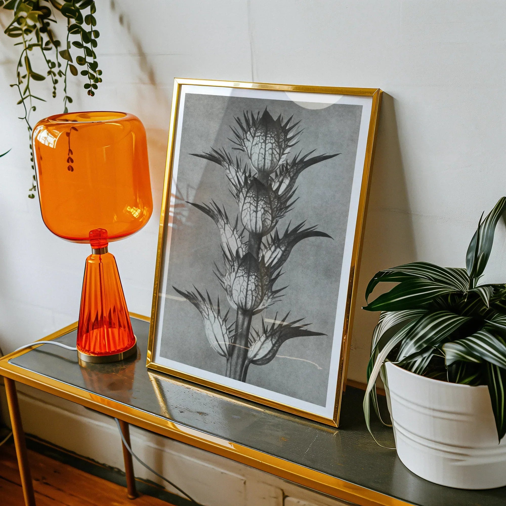 El lente de Blossfeldt revela la simetría oculta de la naturaleza, cada brote es una fortaleza en miniatura coronada con parapetos espinosos. El juego de luces y sombras acentúa cada detalle minucioso, desde el tallo acanalado hasta las hojas que se despliegan, semejantes a un intrincado trabajo de filigrana. Esta impresión no solo decora; invita a la contemplación, cerrando la brecha entre la documentación científica y la pura expresión artística.