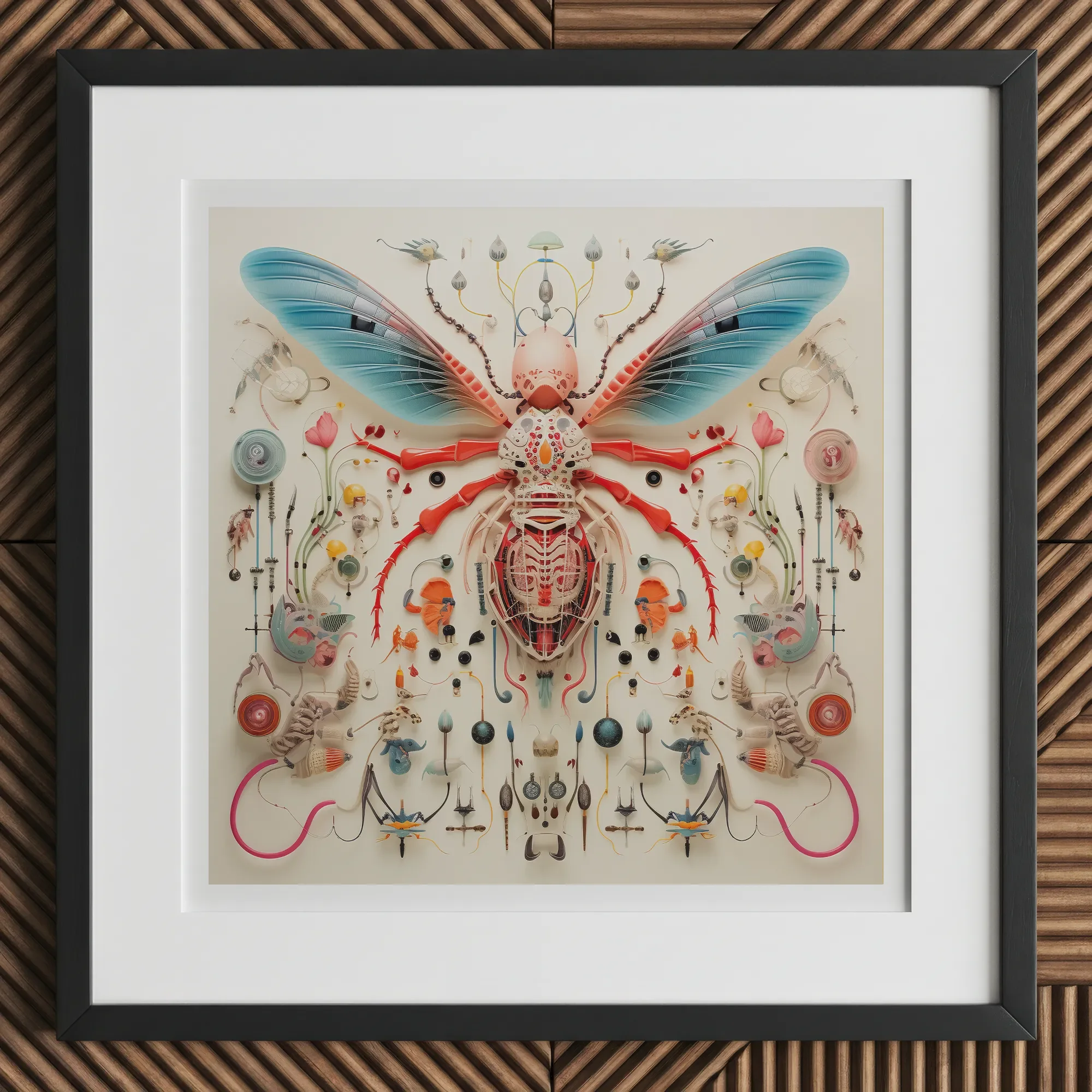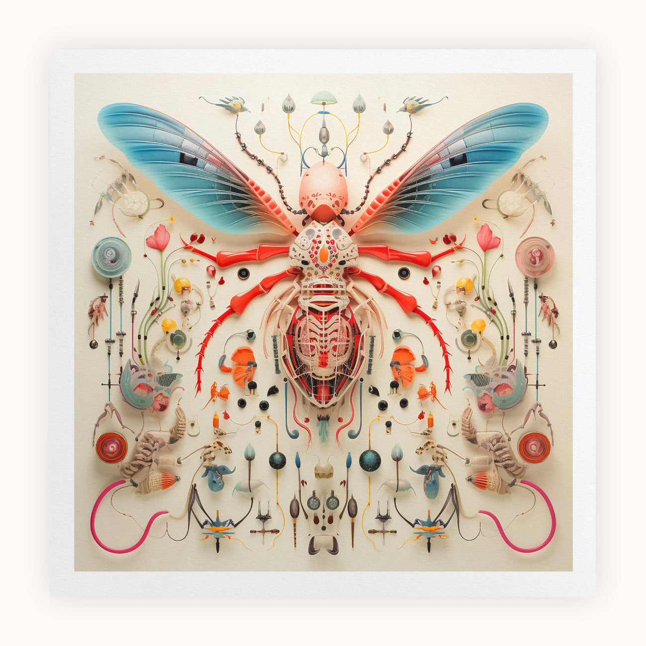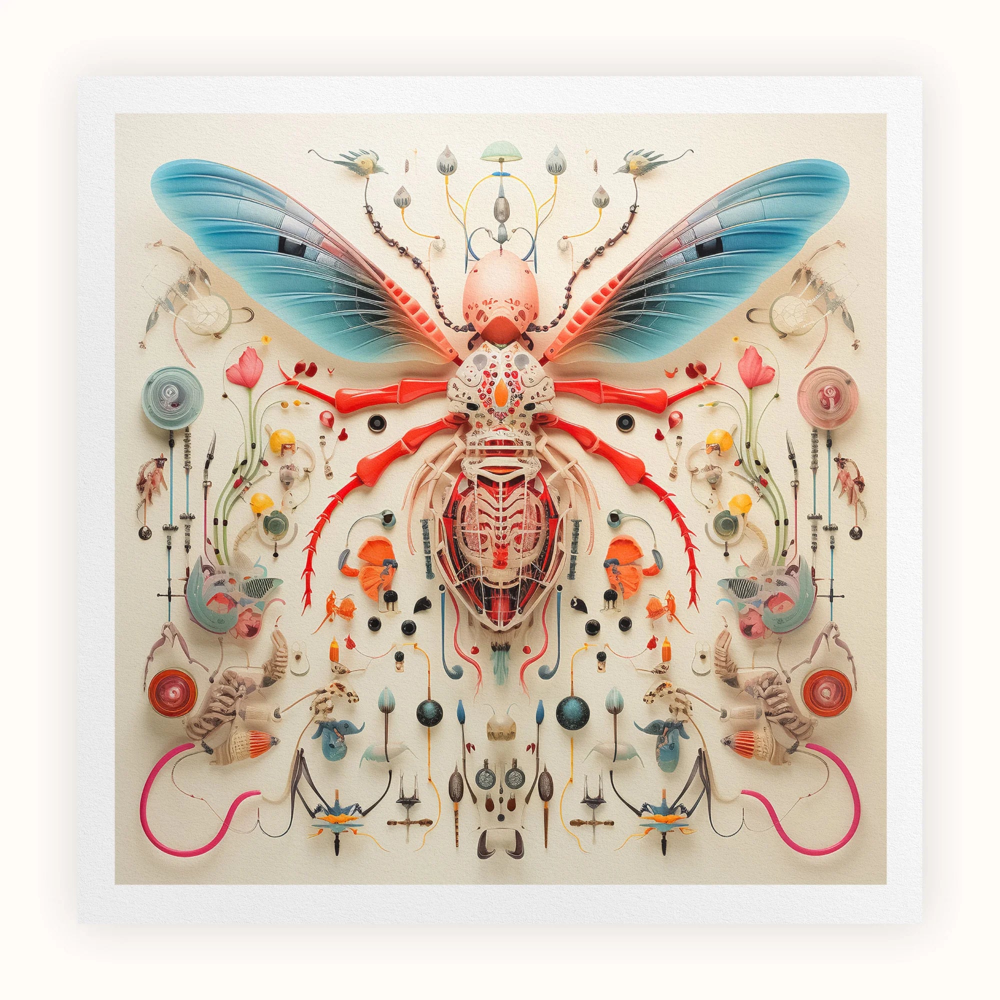 La figura central: una fusión quimérica de avispa, mariposa, y biología alienígena incognoscible: domina la composición con sus alas azules y su exoesqueleto carmesí. Los detalles intrincados evocan tanto la precisión mecánica como la fluidez orgánica, lo que sugiere la adaptación a un ecosistema alienígena. Alrededor de esta maravilla extraterrestre, una variedad simétrica de órganos misteriosos, flora y microfauna crea un cuadro taxonómico que se hace eco de ilustraciones científicas de la era de la iluminación mientras trasciende las limitaciones terrenales.