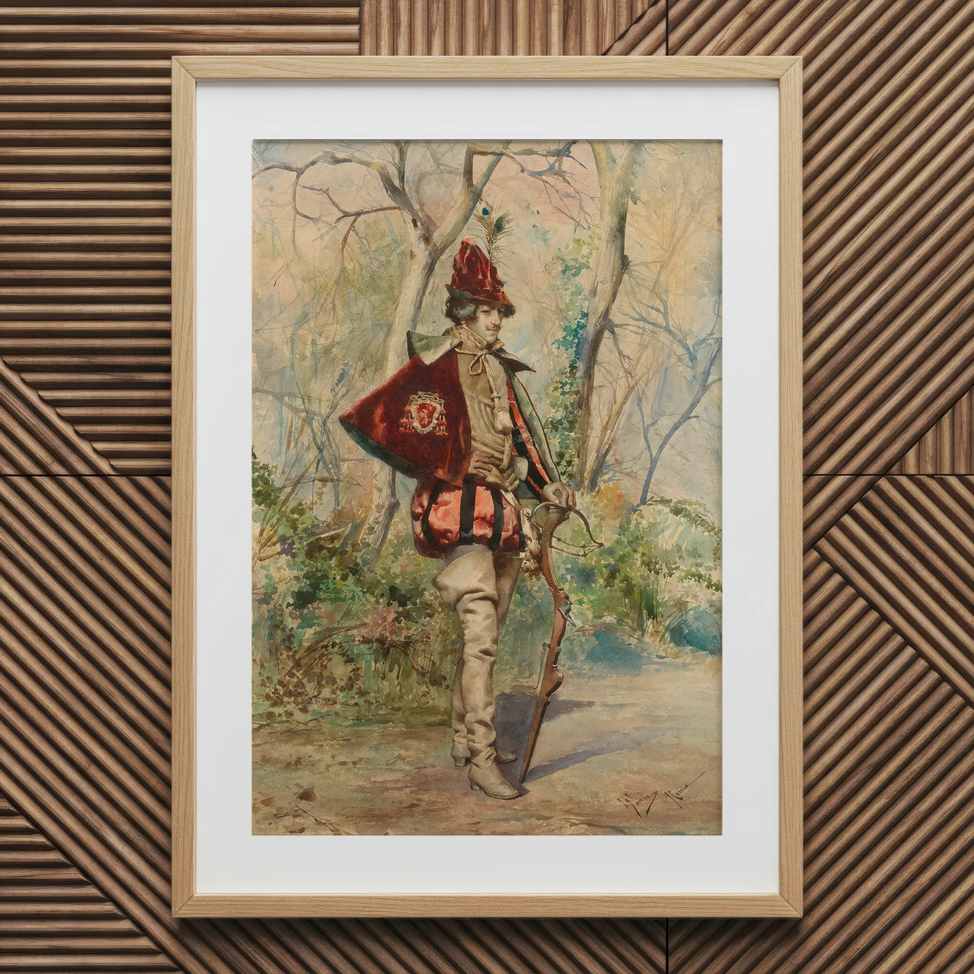 Capa carmesí adornada con sable, sujeta con una sola cuerda dorada que brilla como si fuera parte de la broma. El arco—sin tensión, sin cuerda—descansa en una mano, lánguido como un chisme. Pero el verdadero espectáculo comienza en el sombrero: fieltro de carbón, ala ancha y con estilo, que estalla en una sola pluma de pavo real tan puntiaguda que roza la coquetería.