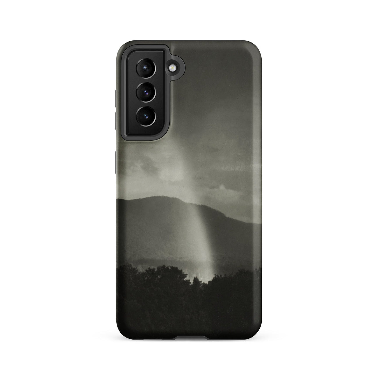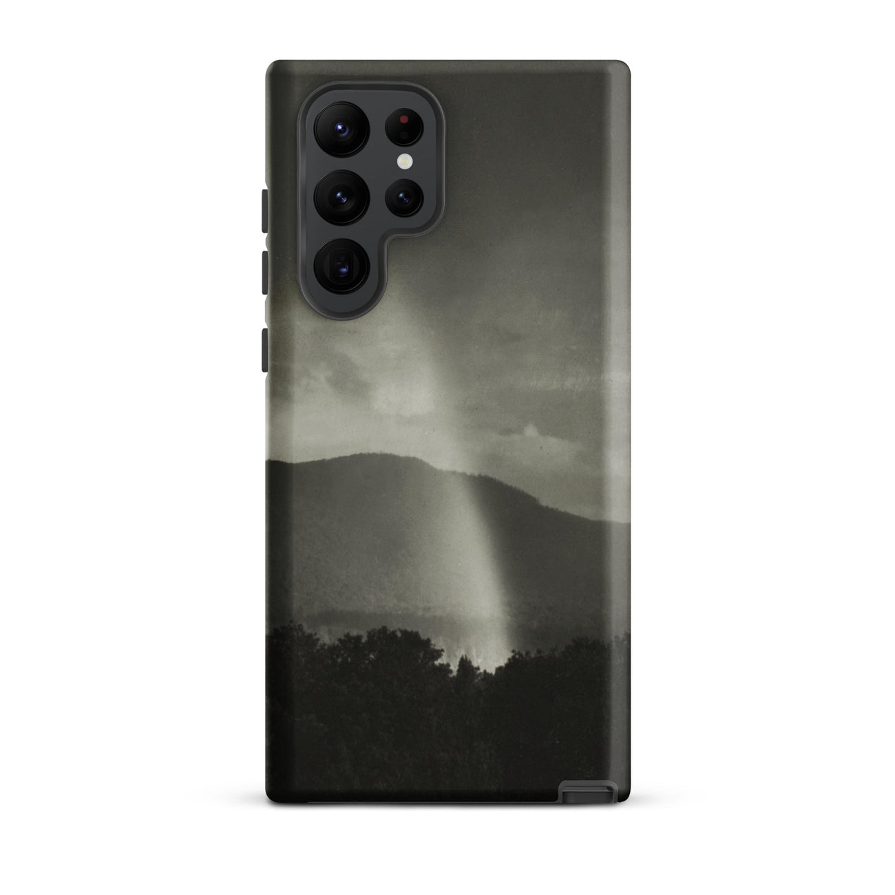 La fotografía respira en gradaciones tonales. Cielos de peltre presionando contra la línea oscura de los árboles, suave vapor disolviéndose en la cresta. Esta funda de Samsung lleva ese silencio capturado, su superficie haciendo eco de las texturas de plata en gelatina, profundo contraste e intervalos luminosos donde el sol toca la lluvia.