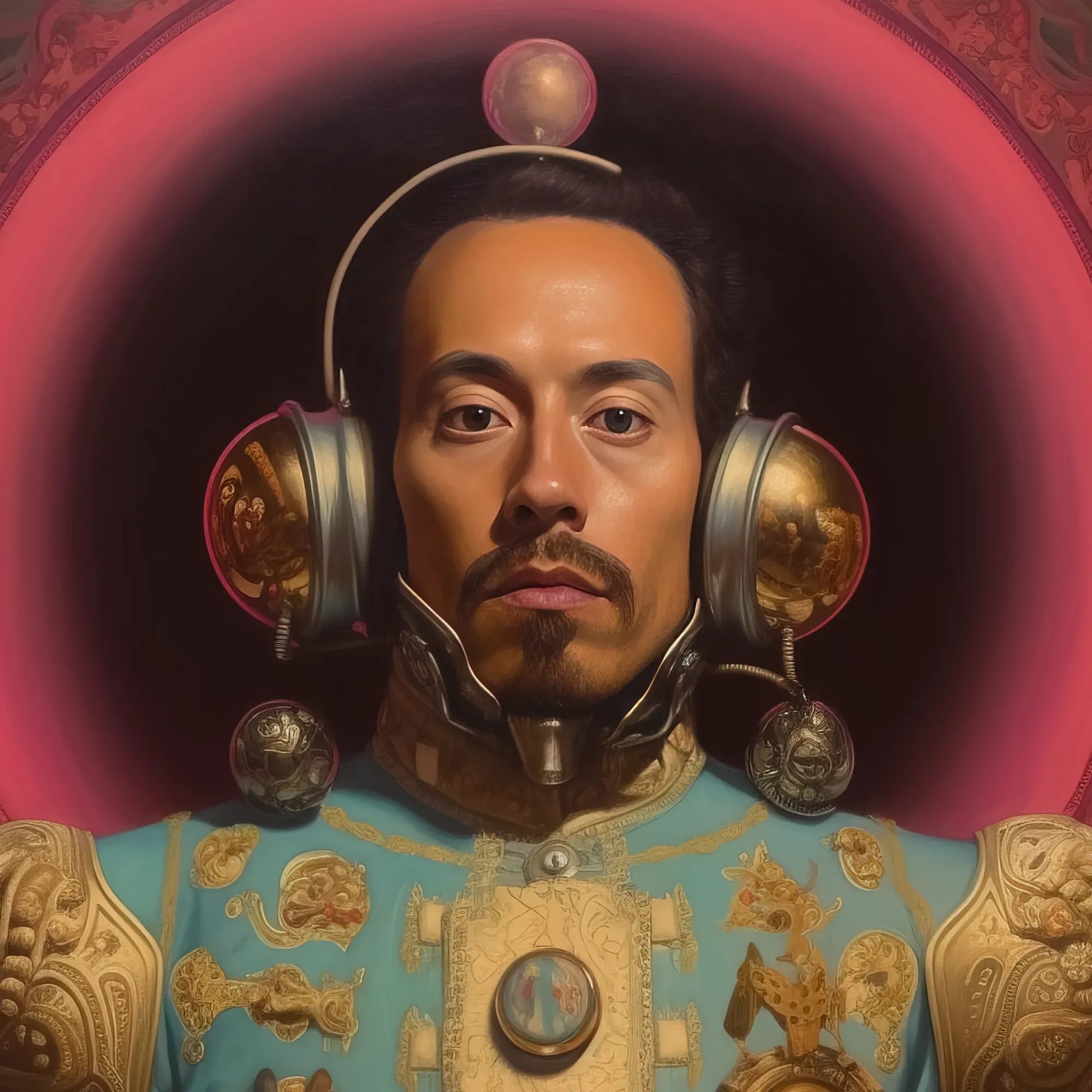 Armando deriva a través del cosmos, un nahual de las nebulosas, un astronauta mexicano gay enmarcado en desafío celestial. Su traje turquesa como las aguas sagradas del Cenote Sagrado. Brilla con filigrana dorada—una segunda piel y declaración de linaje—resonando los intrincados códices de los Mixtecos y Mayas, donde la historia se teje en constelaciones y la resistencia está grabada en el tiempo. Una ofrenda a cada ancestro queer que soñó más allá de las limitaciones de su era.