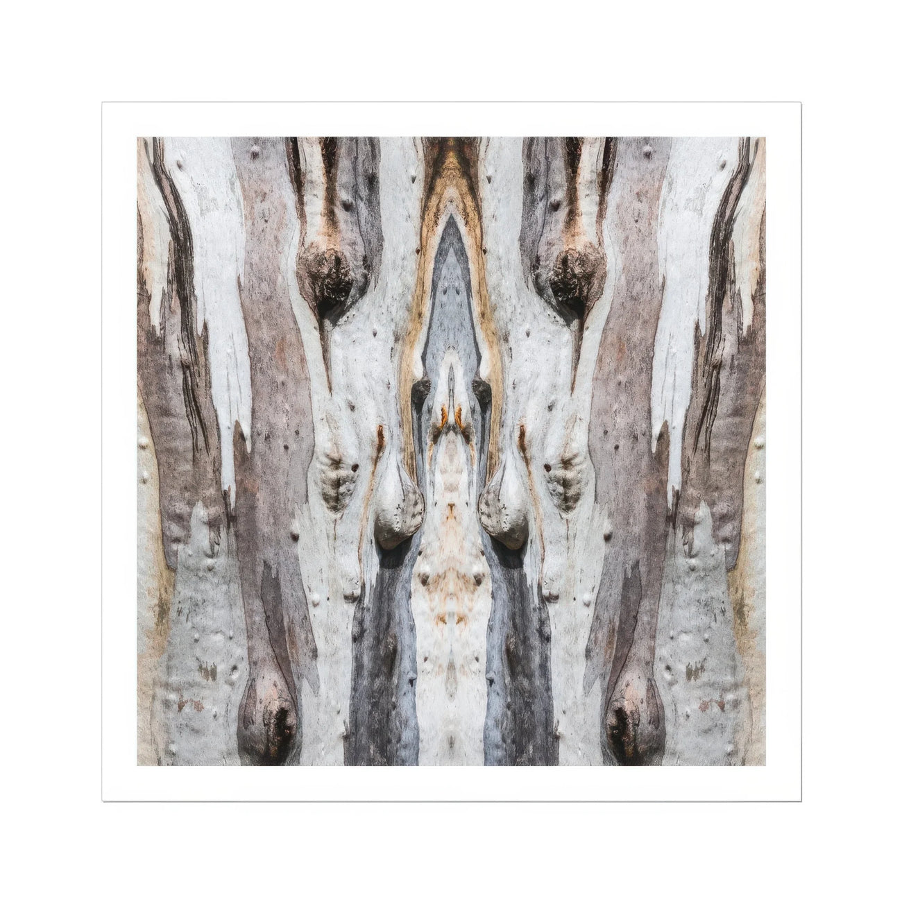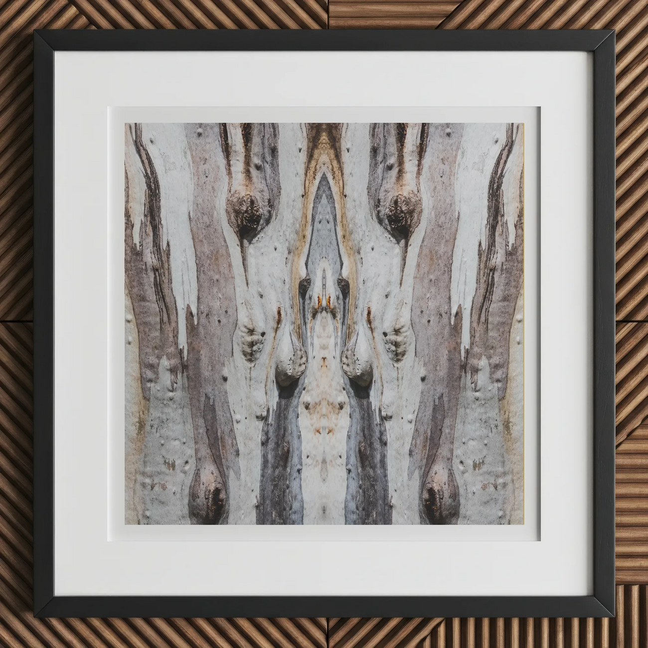 La simetría llamativa de Barking Mad presenta una imagen reflejada de la corteza de un árbol, creando una composición abstracta, casi totémica. El punto focal central se asemeja a una punta de flecha o lanza alargada, atrayendo la mirada hacia arriba. Flanqueando esta forma central hay patrones con textura de corteza, que presentan nudos y crestas orgánicas que crean una sensación de profundidad y carácter.