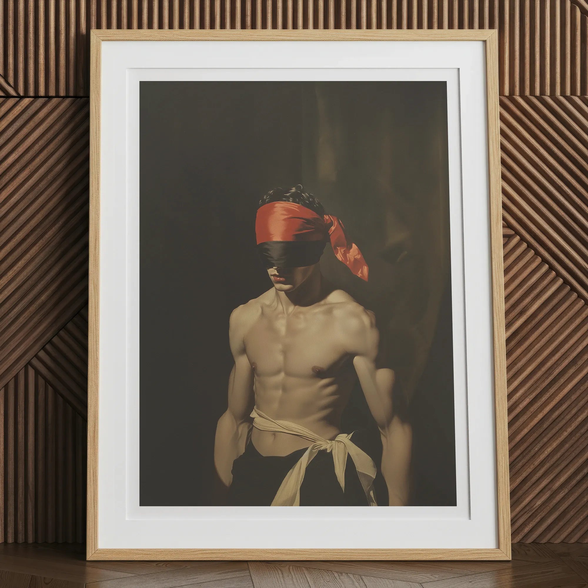 Un cuerpo esculpido en sombra y fuego, su piel capturando la luz como mármol calentado por el tacto. La seda negro carmesí vela sus ojos—anudada con propósito, ciega, ata, manda. Fetichismo gay inspirado en el siglo XIX hablando en susurros de sumisión, secreto y un lenguaje más antiguo que las palabras. ¿Es él la ofrenda o el verdugo? ¿El elegido o el condenado?
