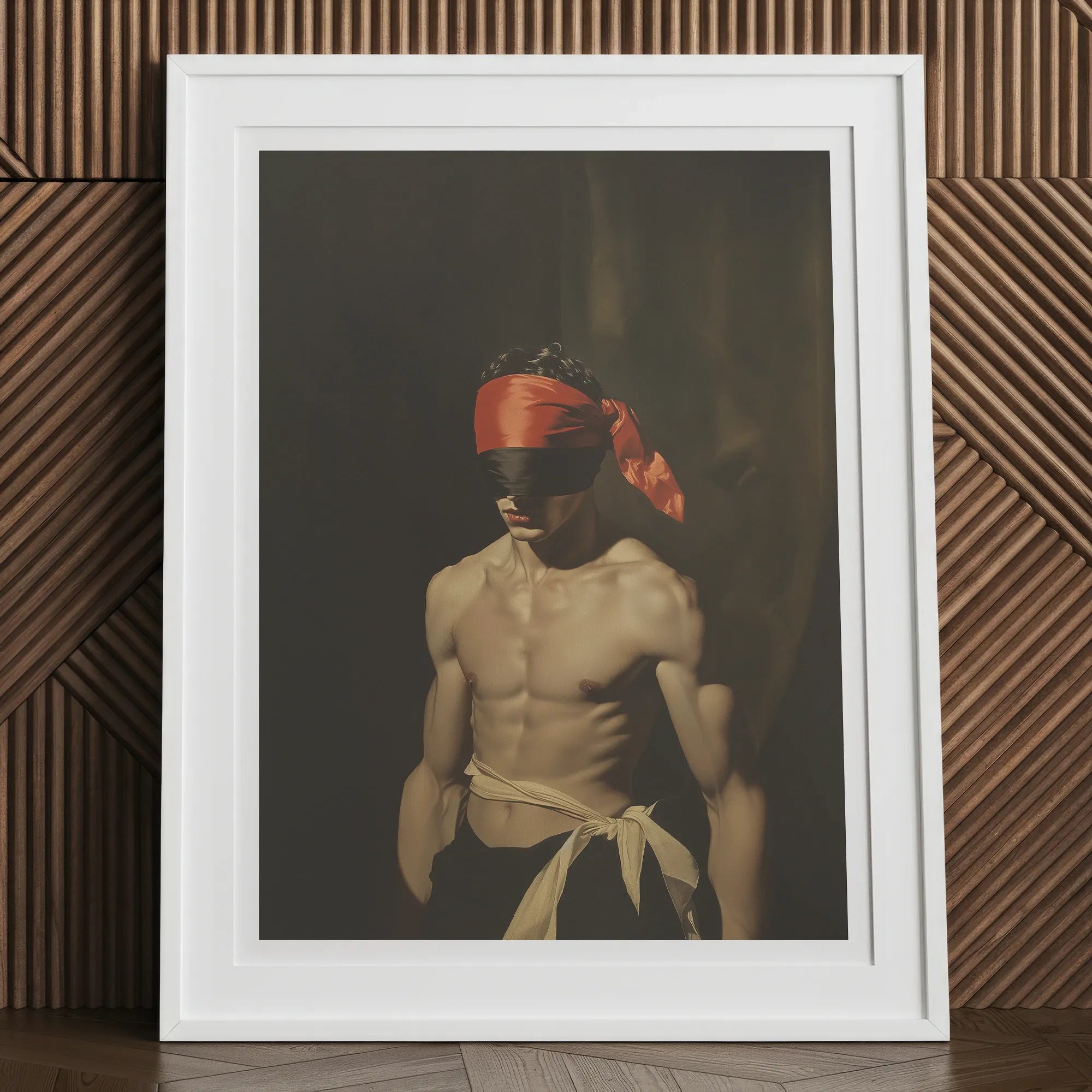 Su torso está desnudo y luminoso, recordando el drama del Barroco chiaroscuro, un renacimiento de los contrastes profundos y sensuales de Caravaggio. Sin embargo, bajo los ecos de la maestría clásica, late un erotismo moderno—una tensión entre control y rendición, visibilidad y anonimato. La faja de marfil en su cintura se pliega como un juramento deshecho, una reliquia de la belleza masculina grecorromana retorcida en algo crudo, indomado.