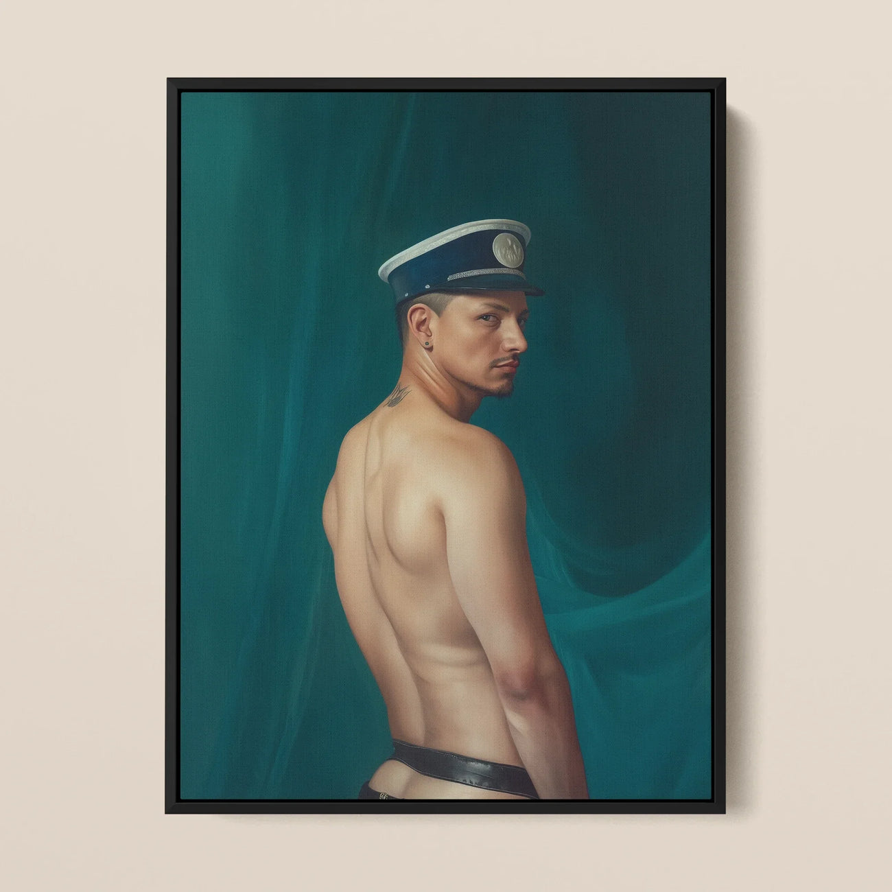 La estética fetichista naval se despliega en cada detalle: esa gorra de marinero inspirada en lo vintage, la correa de cuero deslizándose por debajo de su cintura, el realismo sensual de un cuerpo esculpido tanto por el trabajo como por el deseo. Su masculinidad con el torso desnudo es una paradoja—estoica pero invitante, rígida pero cruda. Arte de pared queer contemporáneo que honra el poder y la vulnerabilidad del deseo homoerótico.