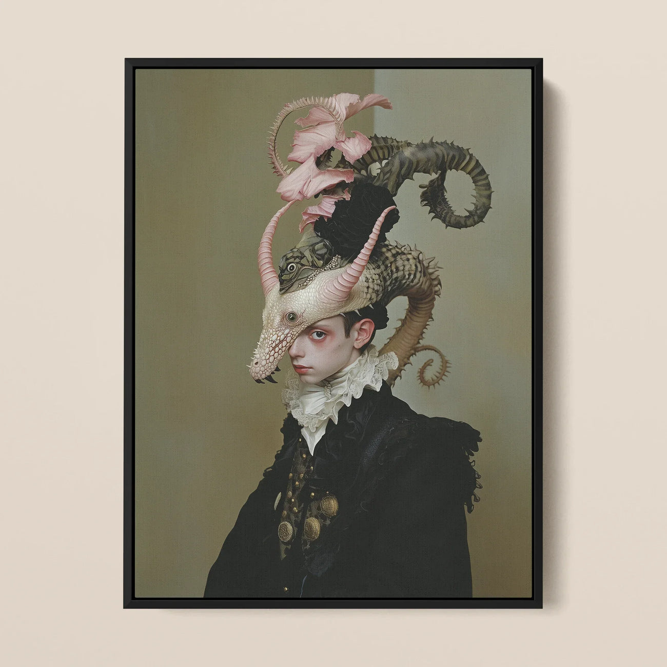 Cadmus es el heredero espectral de una línea de sangre gay indomable—mitad príncipe, mitad dragón, enteramente leyenda. Su rostro—delicado pero inquebrantable—emerge de las sombras del retrato gótico, una visión de surrealismo gay entrelazada con fantasía barroca. Huesos en espiral y con cuernos se retuercen desde su cráneo—un relicario de la oscura aristocracia, fusionando mito reptiliano con elegancia victoriana. Su tocado—parte bestia antigua, parte grotesco ornamental—se curva con la amenaza de la iconografía medieval de dragones, sus espirales doradas apretándose como el mismo destino.