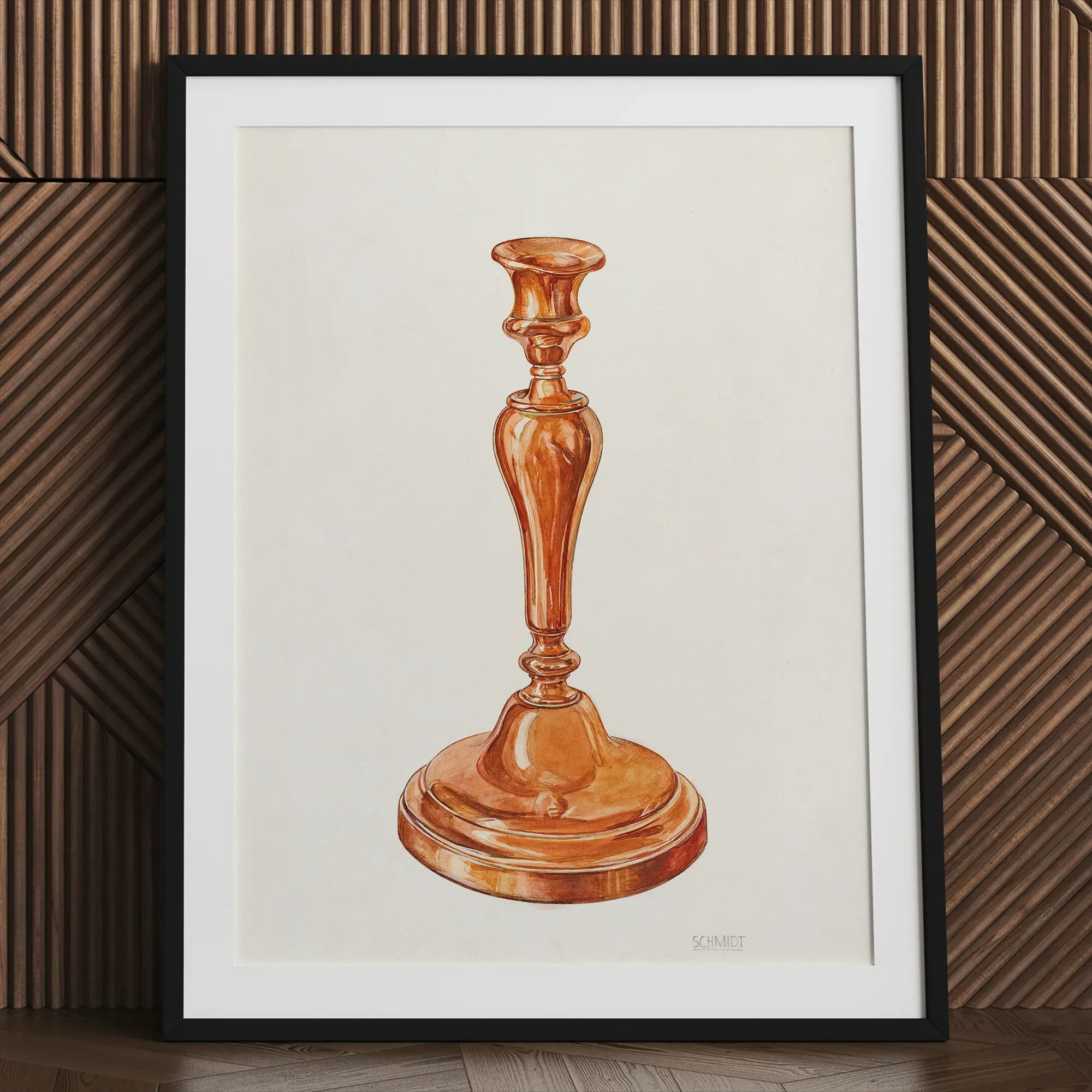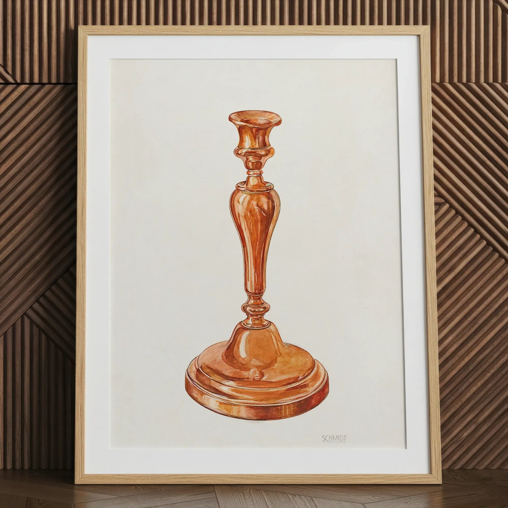 La robusta base del candelabro, adornada con círculos concéntricos, ancla la pieza con estabilidad atemporal. Su esbelto tallo se eleva con gracia, punteado por delicadas estrías y una sección media acampanada que habla de una artesanía experta. La parte superior se ensancha en un cuenco poco profundo, listo para sostener una vela y proyectar un resplandor suave. La meticulosa representación de Schmidt resalta el juego de luces sobre la superficie metálica, desde las sombras ámbar más profundas hasta los reflejos de cobre más brillantes.