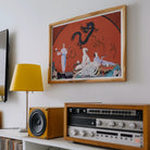 Perderse en la opulenta decadencia de George Barbier"Chez la Marchande de Pavots". Esta obra maestra de Art Deco lo transporta a una suntuosa guarida de opio, donde las figuras languorosas se reclinan en medio de un motín de tonos vibrantes y líneas sinuosas. El ardiente telón de fondo del bermellón, adornado con un dragón chino amenazante, establece un escenario dramático para el cuadro desplegado de elegante desenfreno.