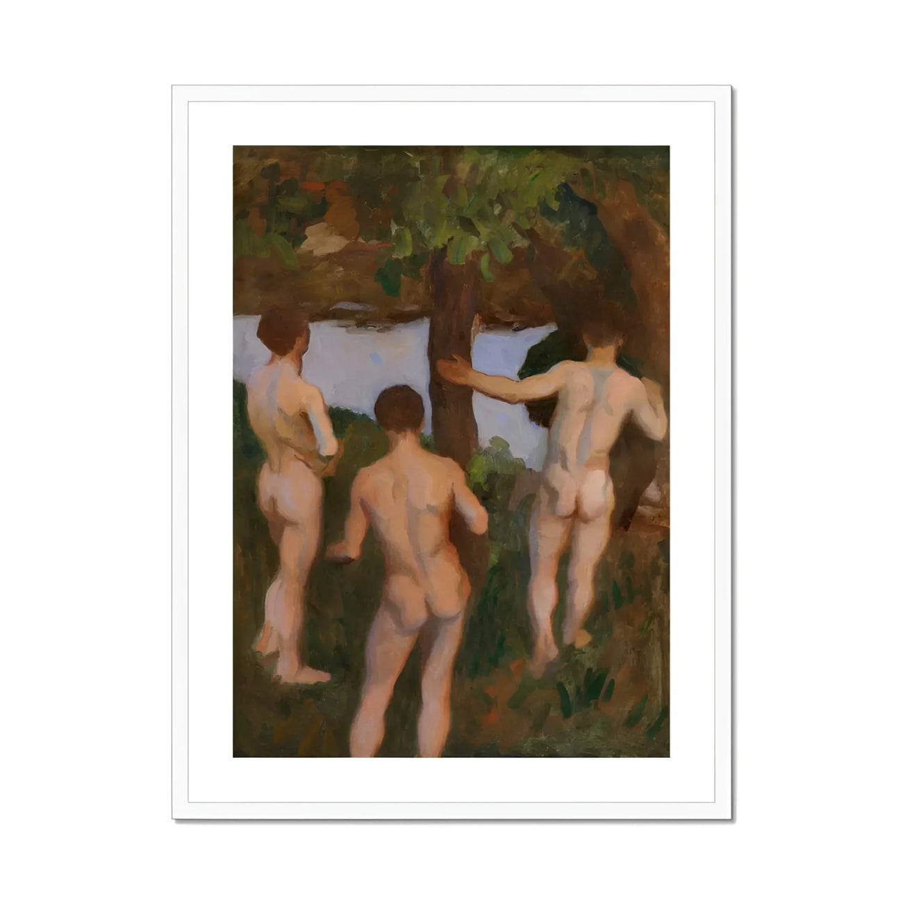 Tres figuras, desnudas y ágiles, se despliegan a lo largo de la orilla como una puntuación mítica—silenciosas pero declarativas, cada espalda vuelta como si descifraran el lenguaje del agua. Boys on the Beach de Ferenczy no es un idilio; es un rito. Extremidades representadas en melocotón magullado y marfil sonrojado se enroscan alrededor de un árbol como si fuera tanto altar como testigo. Un chico levanta un brazo. A medio gesto, medio ofrecimiento. Levantado como un ala lista para volar por primera vez.