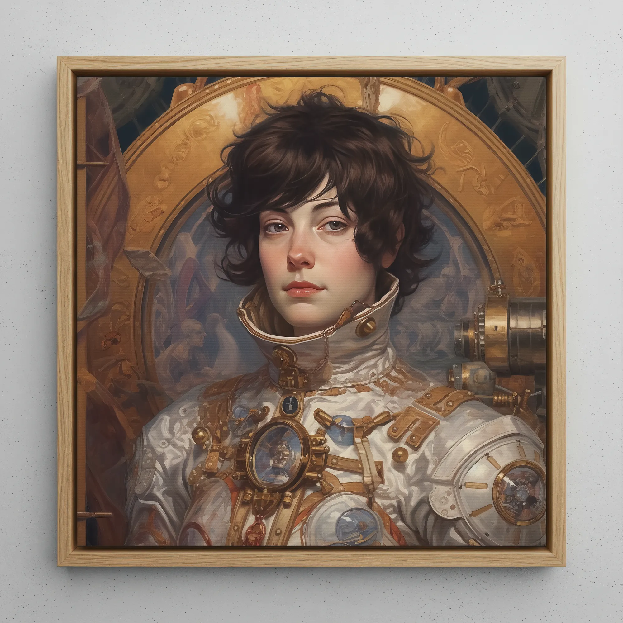Chloé flota a través de la marea astral, una lesbiana francesa astronauta suspendida entre la gravedad y la memoria. Su traje es una maravilla de la ingeniería aeroespacial steampunk, resplandeciente bajo el silencio del espacio profundo—un exotraje celestial ornamentado donde el barroco filigrana de latón se entrelaza con la fría precisión del retrofuturismo. Cada dial, cada lente pulida, es un artefacto de otro mundo, una fusión de la estética de art nouveau de ciencia ficción y el pulso de la innovación.