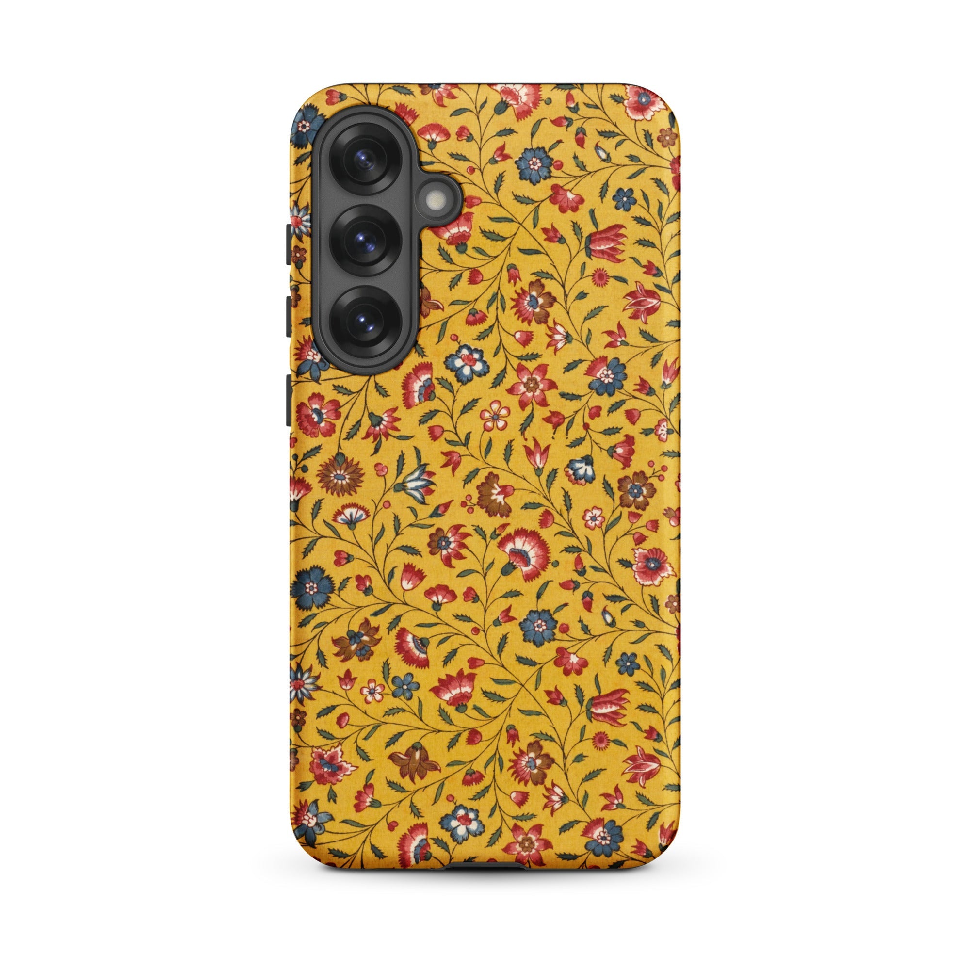 Los claveles presionan su peso arrugado a través de una extensión de vara de oro. Esta funda de tela floral para Samsung traduce siglos de artes decorativas en una forma del tamaño de la palma: el trabajo de enredaderas serpenteantes recuerda los diseños de papel tapiz de Arts and Crafts arraigados en los experimentos de la Casa Roja de William Morris.