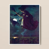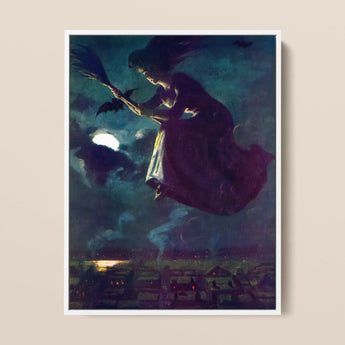 La leyenda es específica: una escoba con cerdas abiertas, una muñeca corrigiendo para el viento cruzado, un pueblo respirando en finas cuerdas de humo. Raíces irlandesas e ilustración de era de revistas le dan a la bruja velocidad moderna, no pánico medieval. Ella navega el campo índigo, eligiendo altitud sobre amenaza, trazando un horizonte constante sobre techos y agua. Cuidado, sí, pero sobre todo presta atención a su competencia.