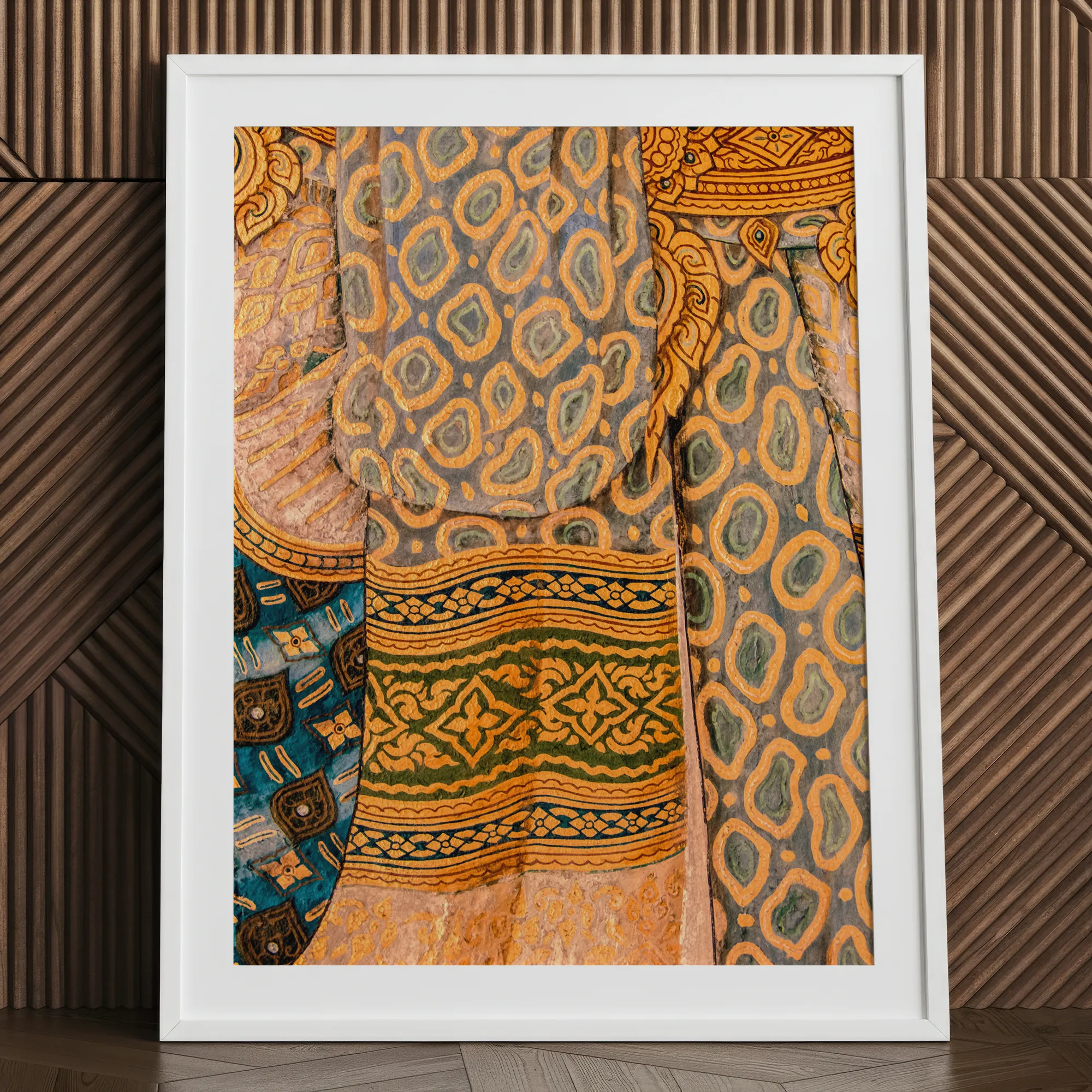 Serás transportado a las cámaras doradas de la realeza siamesa con este cautivador mural tailandés estampado de arte. Deleite sus ojos en su tentador tapiz de ocre y verde azulado, donde los patrones intrincados bailan a través de telas suntuosas que se ajustan a un monarca. Los óvalos hipnóticos y las fronteras geométricas reales susurran historias de artesanía incomparable, cada pincelada es un testimonio de siglos de tradición artística.