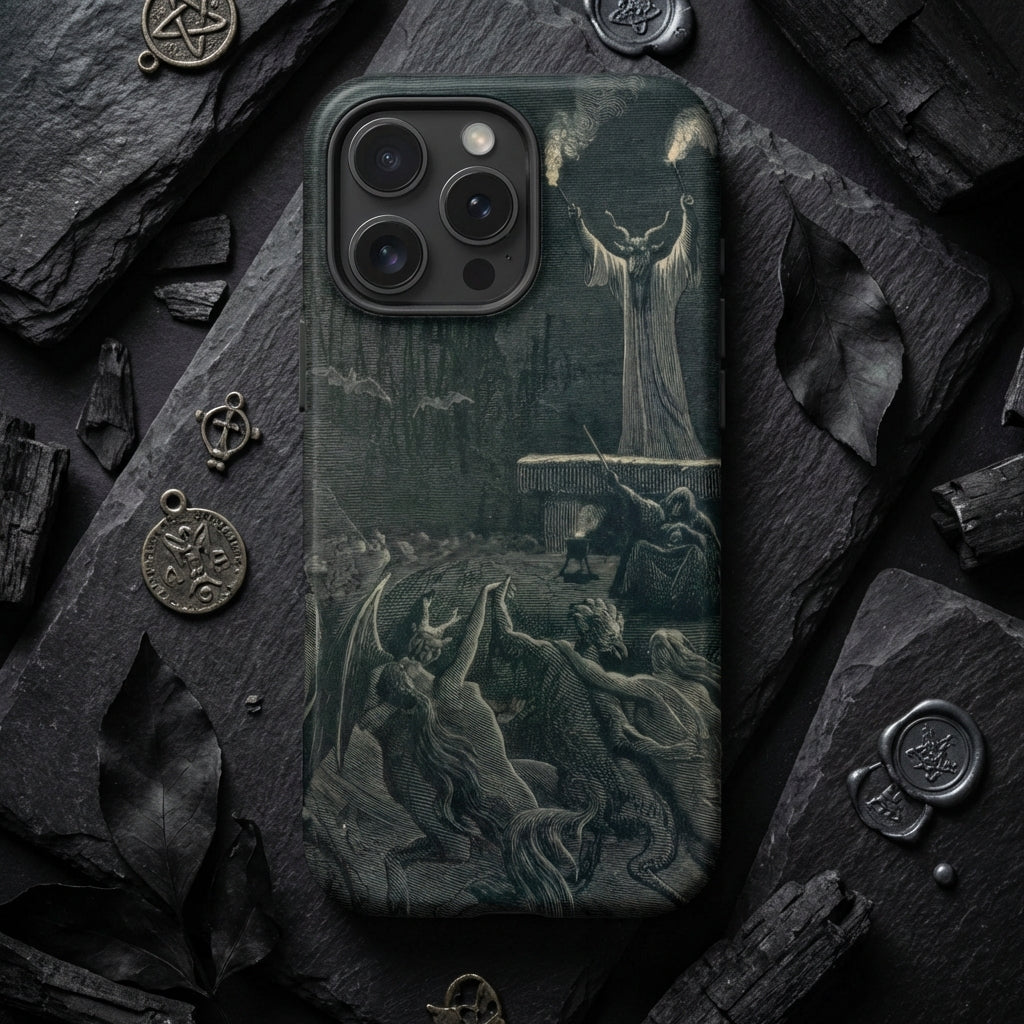 La funda del iPhone captura el drama del grabado del siglo XIX: horror romántico fusionado con imaginación gótica, grabado visionario impregnado del renacimiento ocultista, texturas grabadas vibrando con energía infernal. Murciélagos parpadean por el cielo mientras cuerpos monstruosos se retuercen en una coreografía violenta, evocando el folclore de la brujería, la imaginería ritual satánica y las inspiraciones literarias de Dante a Milton.