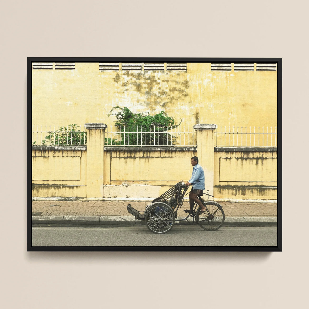 Contempla al conductor del cyclo, una encarnación viviente de la tenacidad jemer, mientras navega por la confluencia de eras. La desgastada pared ocre detrás de él susurra cuentos de la influencia colonial francesa, mientras que estallidos de flora verde sugieren la persistencia de la naturaleza en las junglas de concreto.