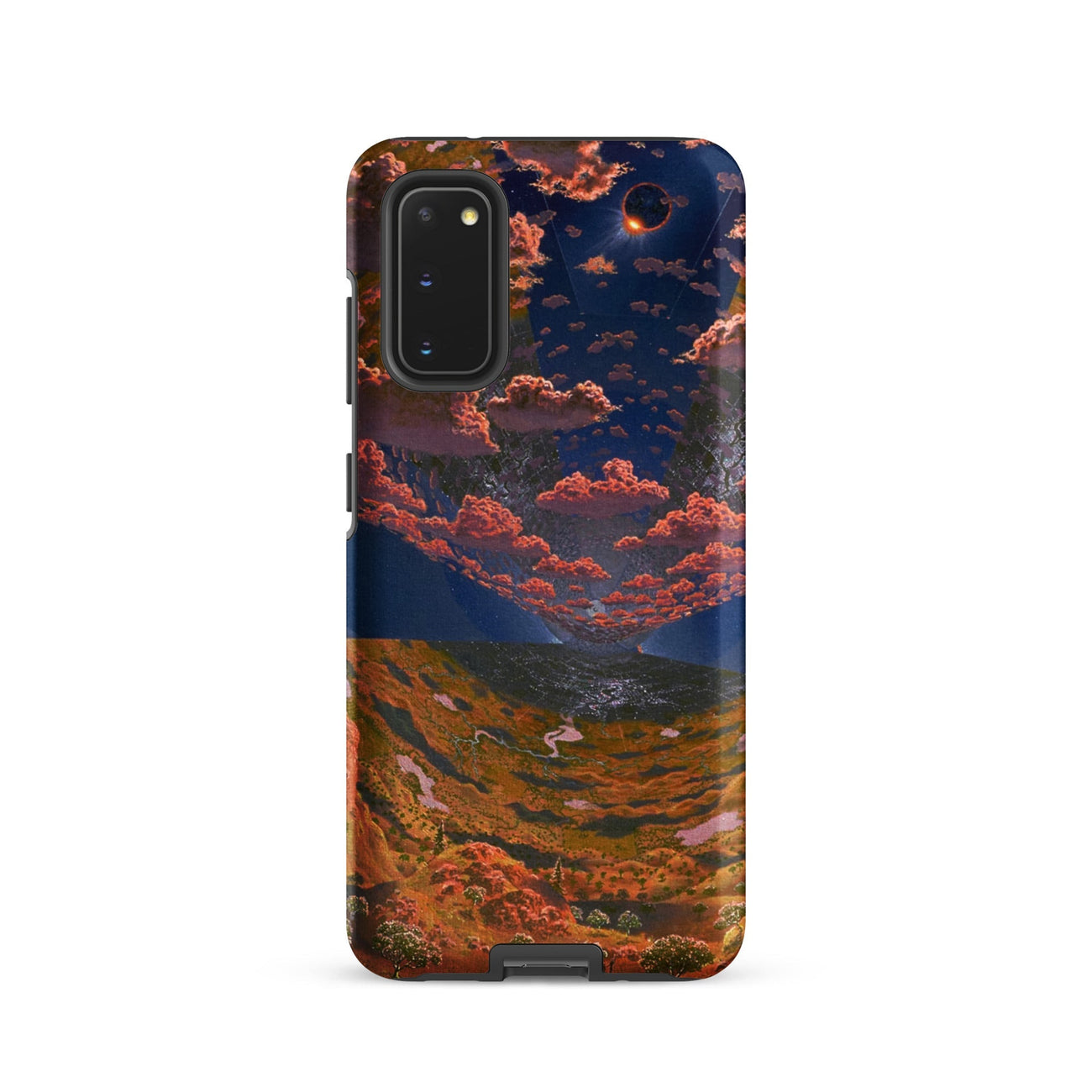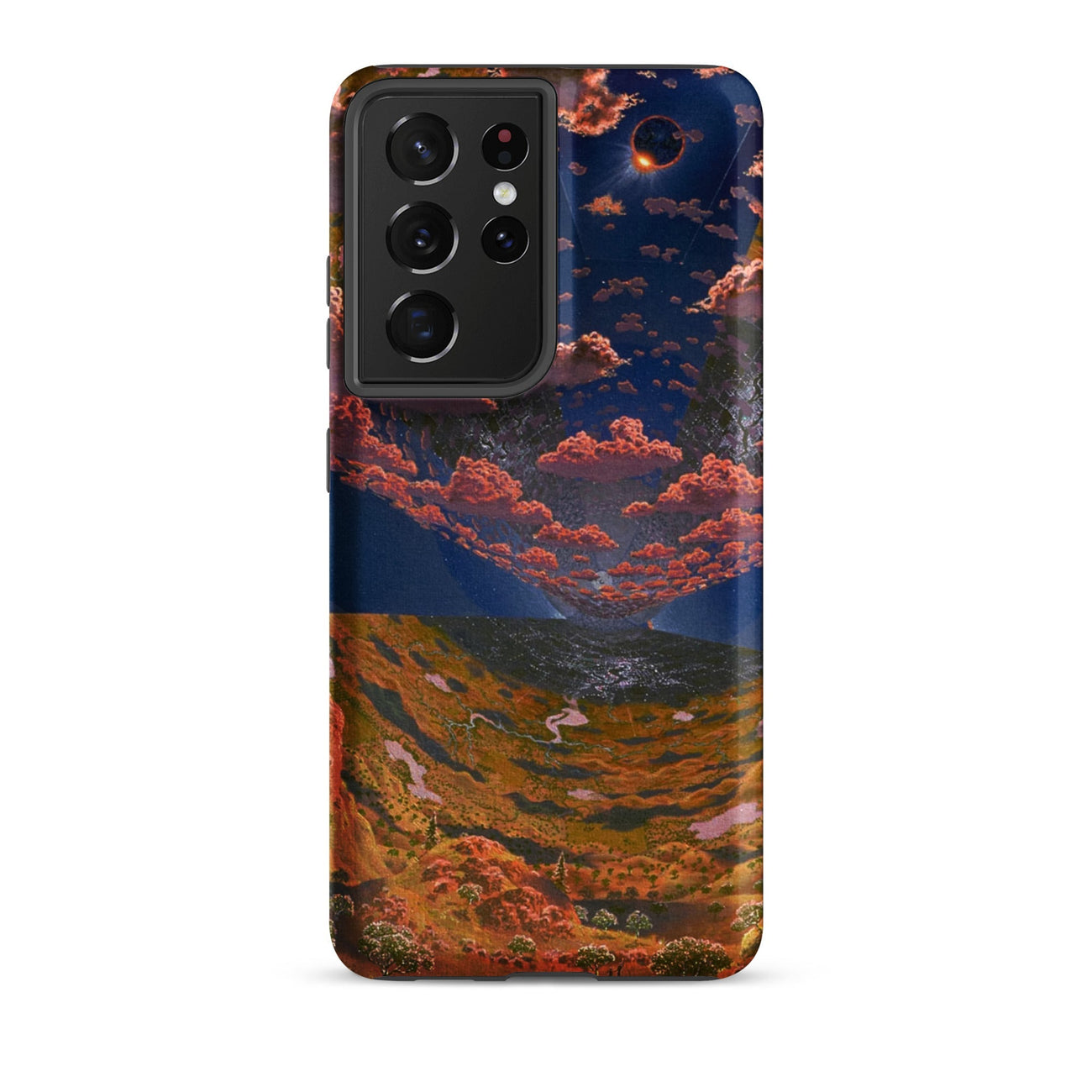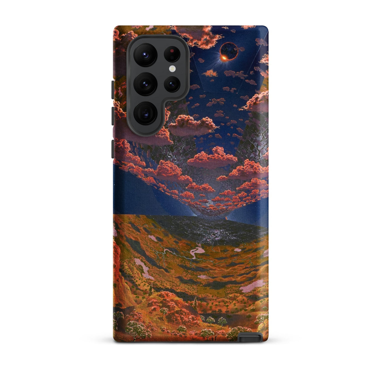 Un hábitat celestial se despliega a través de tu funda Samsung, reimaginado a través de la visión de Don Davis sobre el Cilindro de O'Neill. Arriba, una bóveda de cielo cobalto rebosa de nubes de coral, sus bordes iluminados por un sol lejano. Abajo, una curva de terreno ocre se extiende con ríos de plata, bosques y crestas que se doblan hacia el infinito.