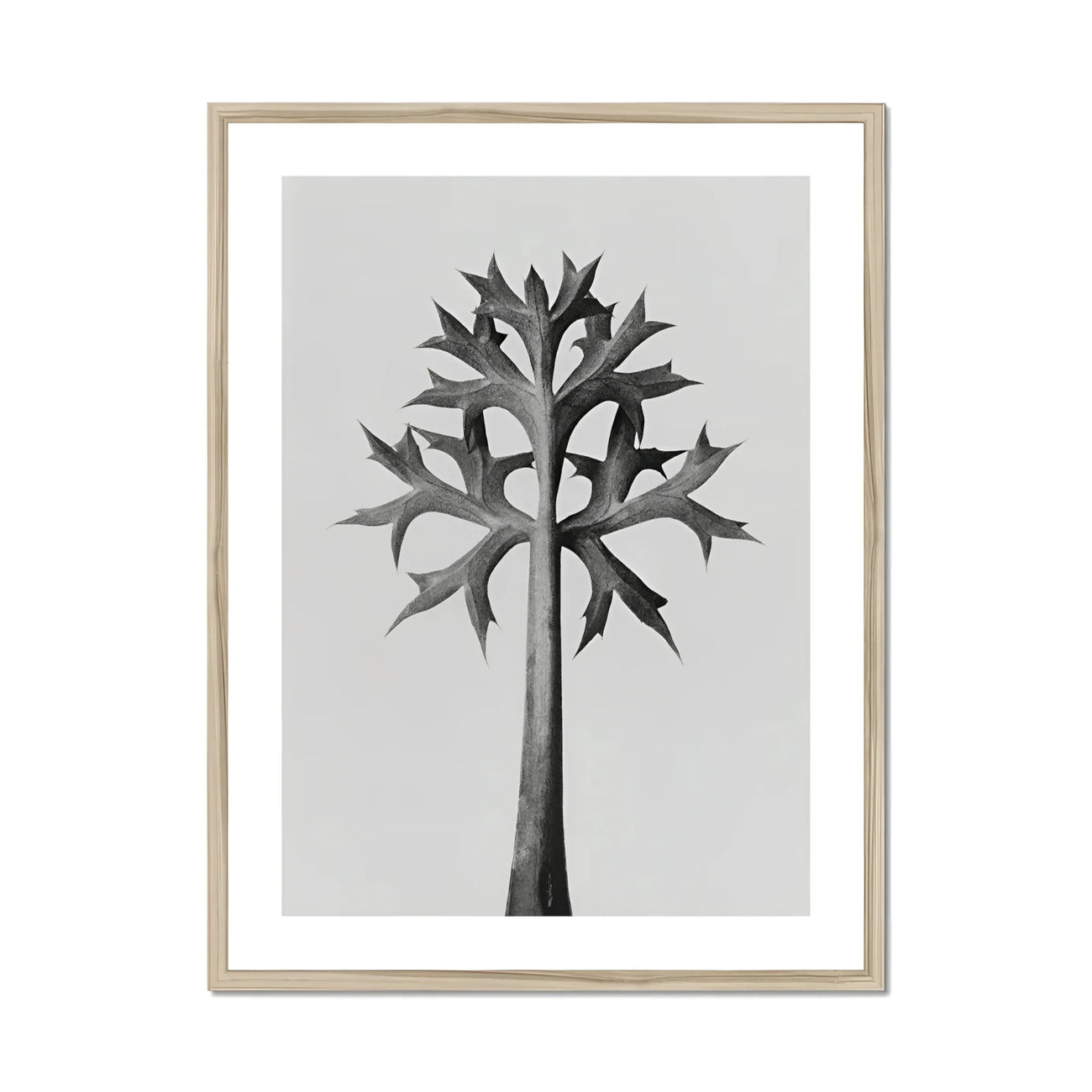 Estás mirando un retrato monocromático fascinante de la destreza arquitectónica de la naturaleza. Esta bien estampado de arte Captura la icónica fotografía de Karl Blossfeldt de Eryngium bourgatii, el acebo del mar Mediterráneo, en toda su gloria escultural.