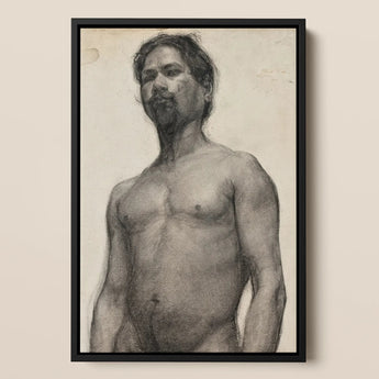 El carbón respira a través del papel crema, dando forma a un torso desnudo que confronta la mirada con gravedad y resistencia silenciosa. El dibujo de Tanner, circa 1891, ancla los hombros, el pecho tenso, el sutil ascenso del abdomen, un cuerpo que es a la vez modelo y monumento.