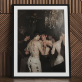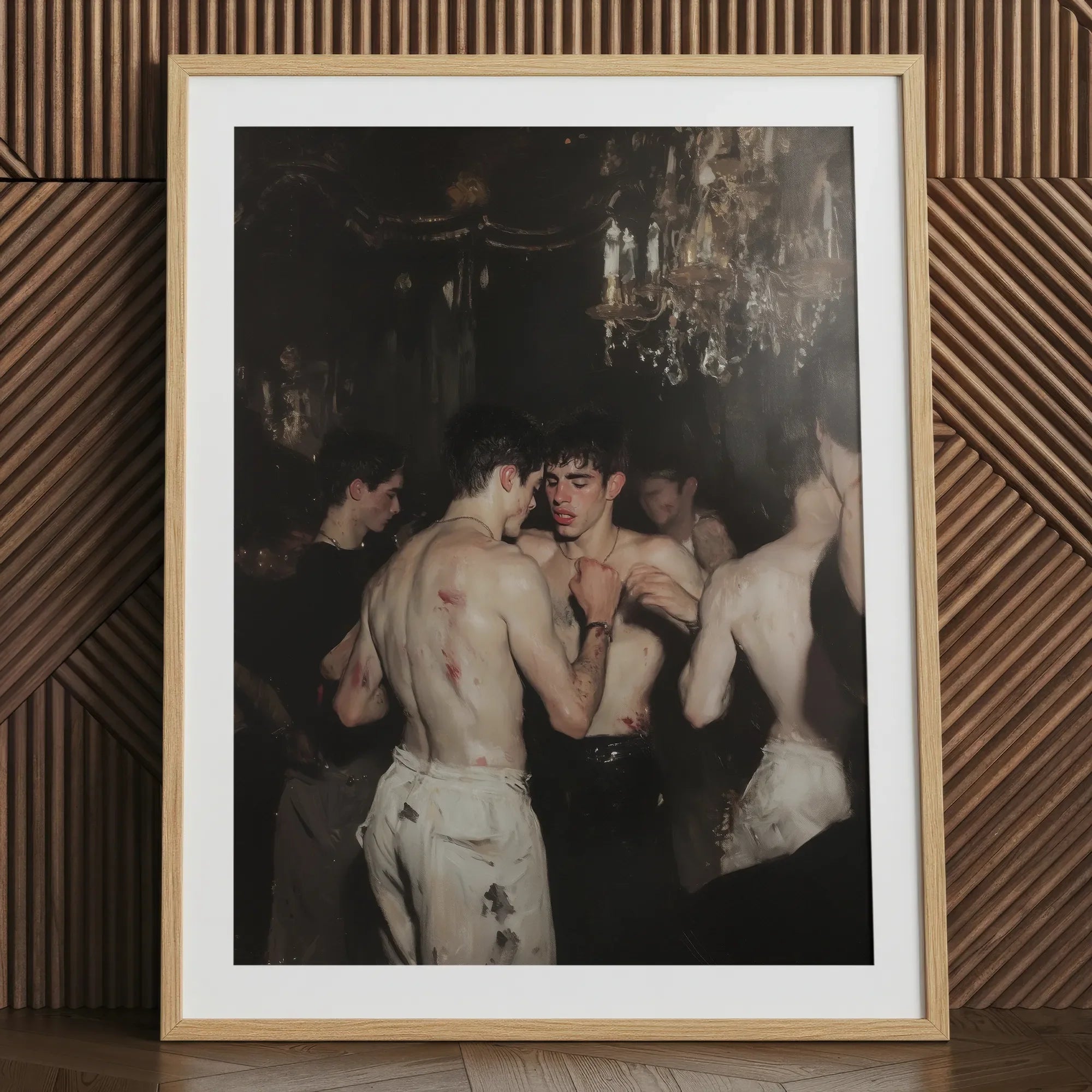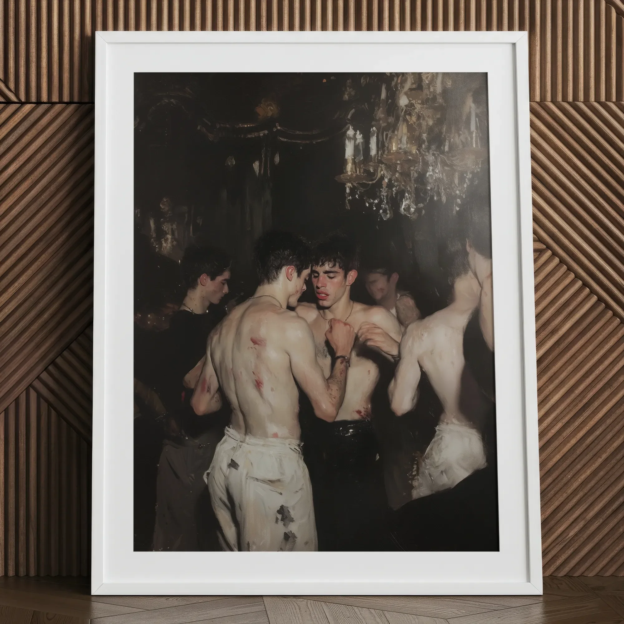 En algún lugar entre el puño y el perdón, sus cuerpos descansan en la réplica. Sin camisa y coronados en este barroco club de lucha gay. Iluminados desde arriba como santos condenados esperando el veredicto. Torsos brillando como yeso roto. Su piel es un lienzo de rosas y violetas jaspeadas, cada abrasión un dialecto de cercanía. Alabastro blanco manchado con mordiscos de amor rojo rubí. Una sintaxis de claroscuro de adoración fracturada.