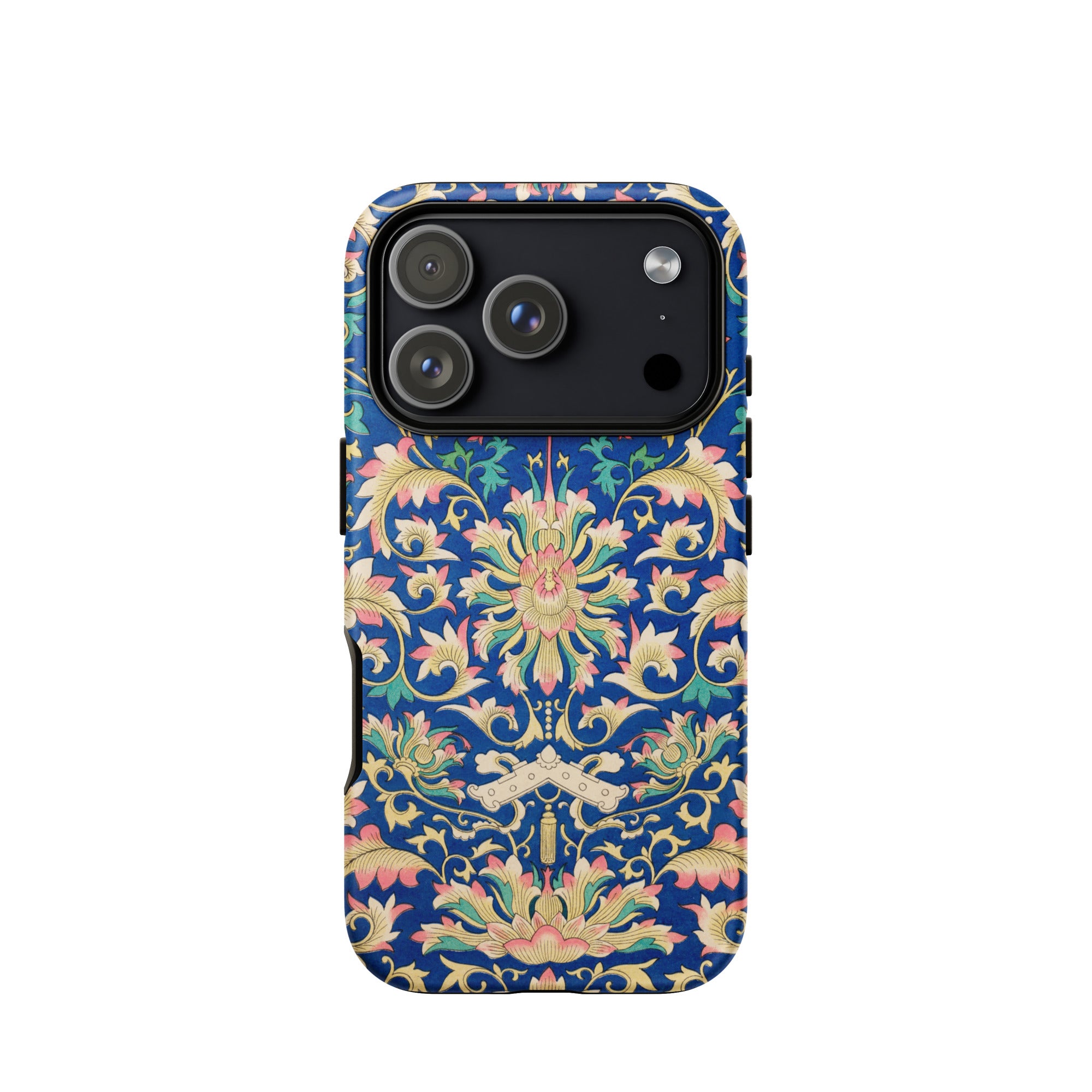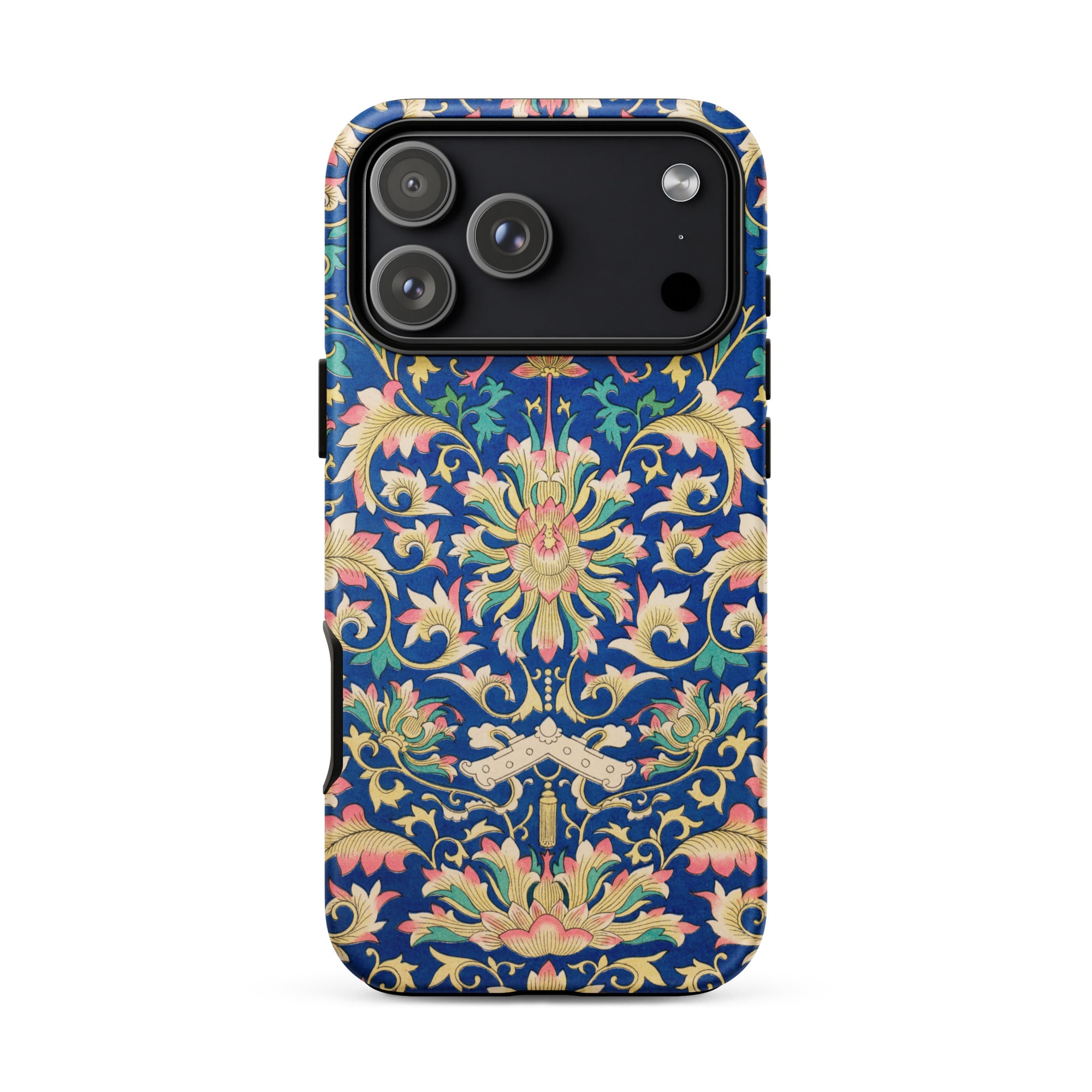 Plantarse en la chinaiserie de Owen Jones inspirado en iPhone Caso, una fusión vibrante de estética victoriana e influencias orientales. Esta maravilla ornamental muestra patrones florales intrincados contra un rico telón de fondo azul, haciendo eco de las técnicas de cromolitografía revolucionaria de Jones. Las delicadas flores de loto y las hojas de acanto giratorias se entrelazan, creando un tapiz fascinante de crema, rosa y tonos verde azulado.
