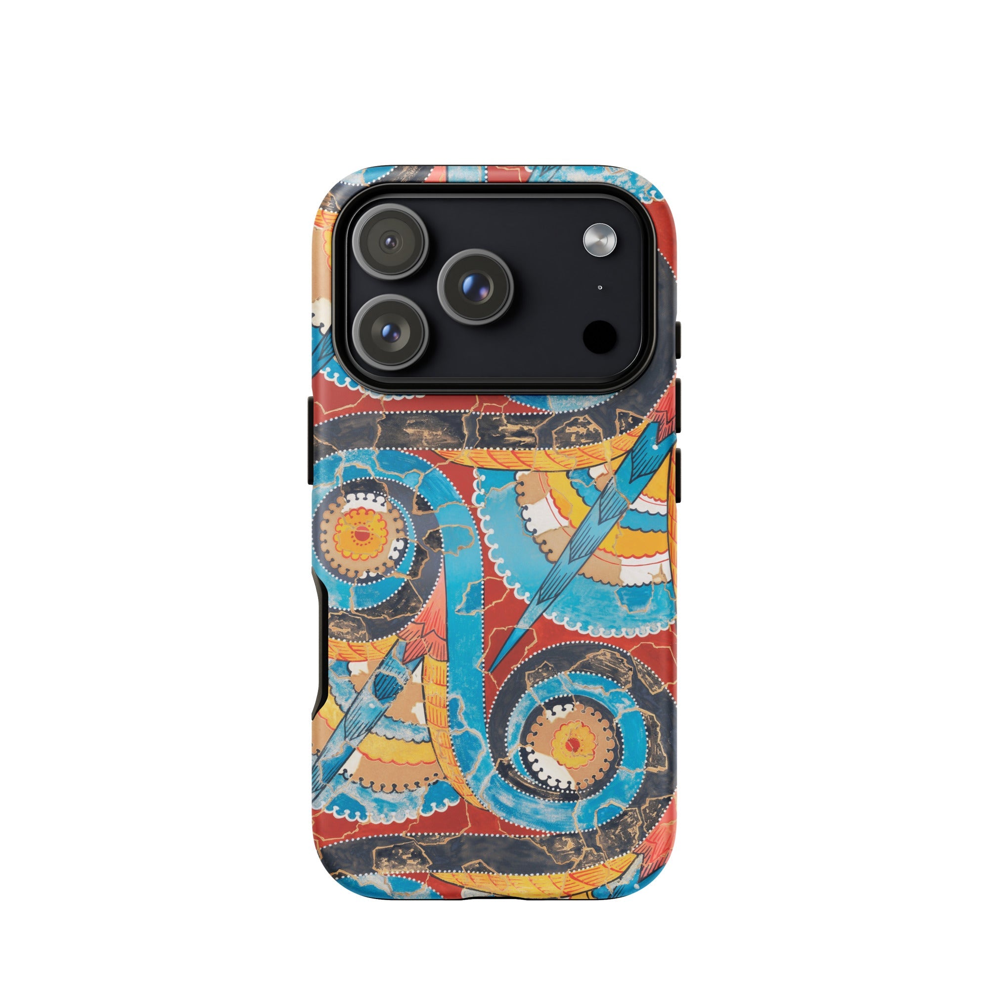 Una funda de iPhone con espiral minoica donde el tiempo se fractura pero nunca se desvanece. Esta funda de teléfono inspirada en Emile Gilliéron revive la energía fluida de los frescos antiguos del Egeo, sus laberintos en espiral que resuenan con el pulso de una civilización perdida. Ocre vívido, cobalto profundo y sienna terrosa se entrelazan como engranajes celestiales, evocando el movimiento de las mareas, el ritmo del mito. Arte arqueológico se encuentra con protección moderna, las texturas agrietadas susurran sobre palacios desgastados por el tiempo, de pinturas murales de Knossos renacidas.
