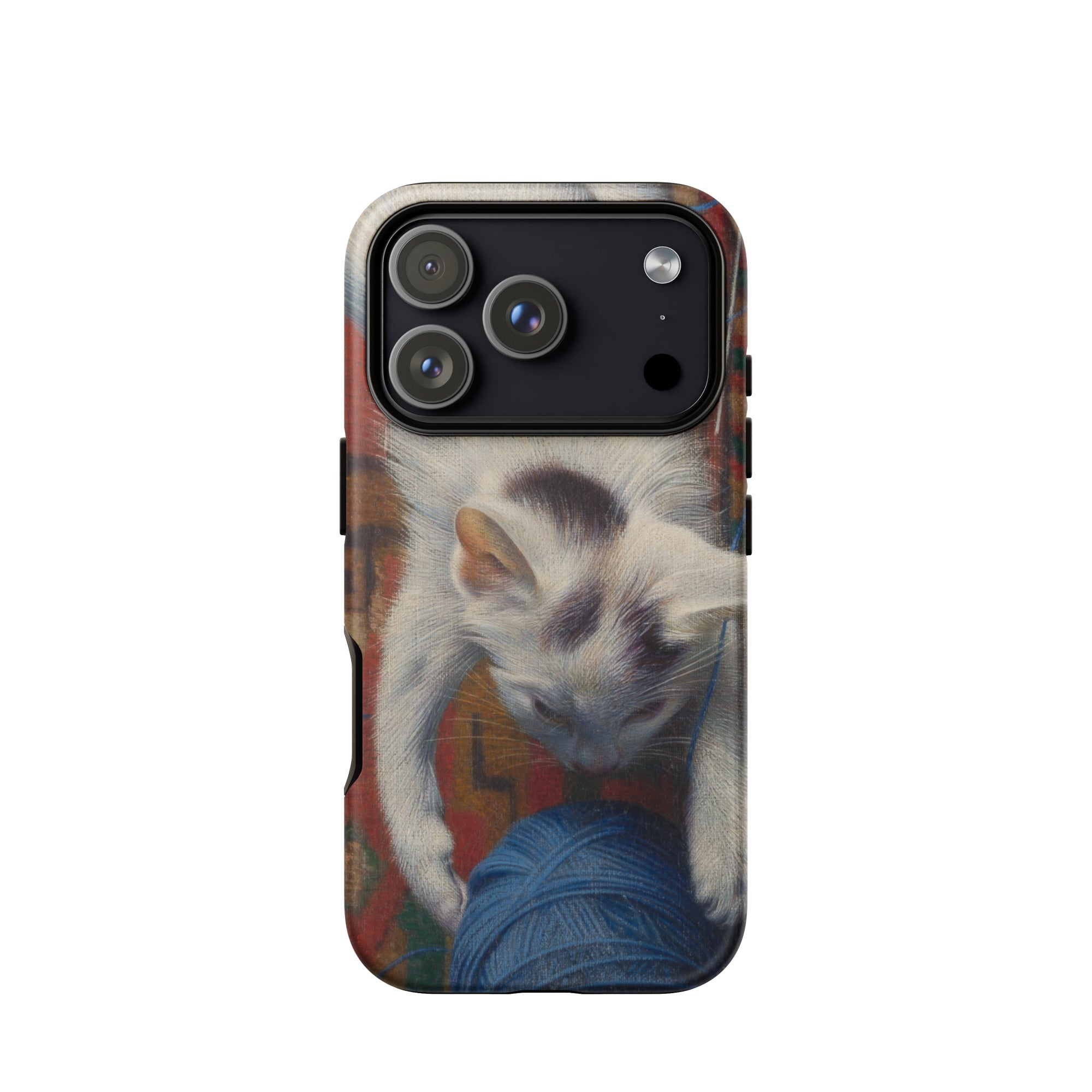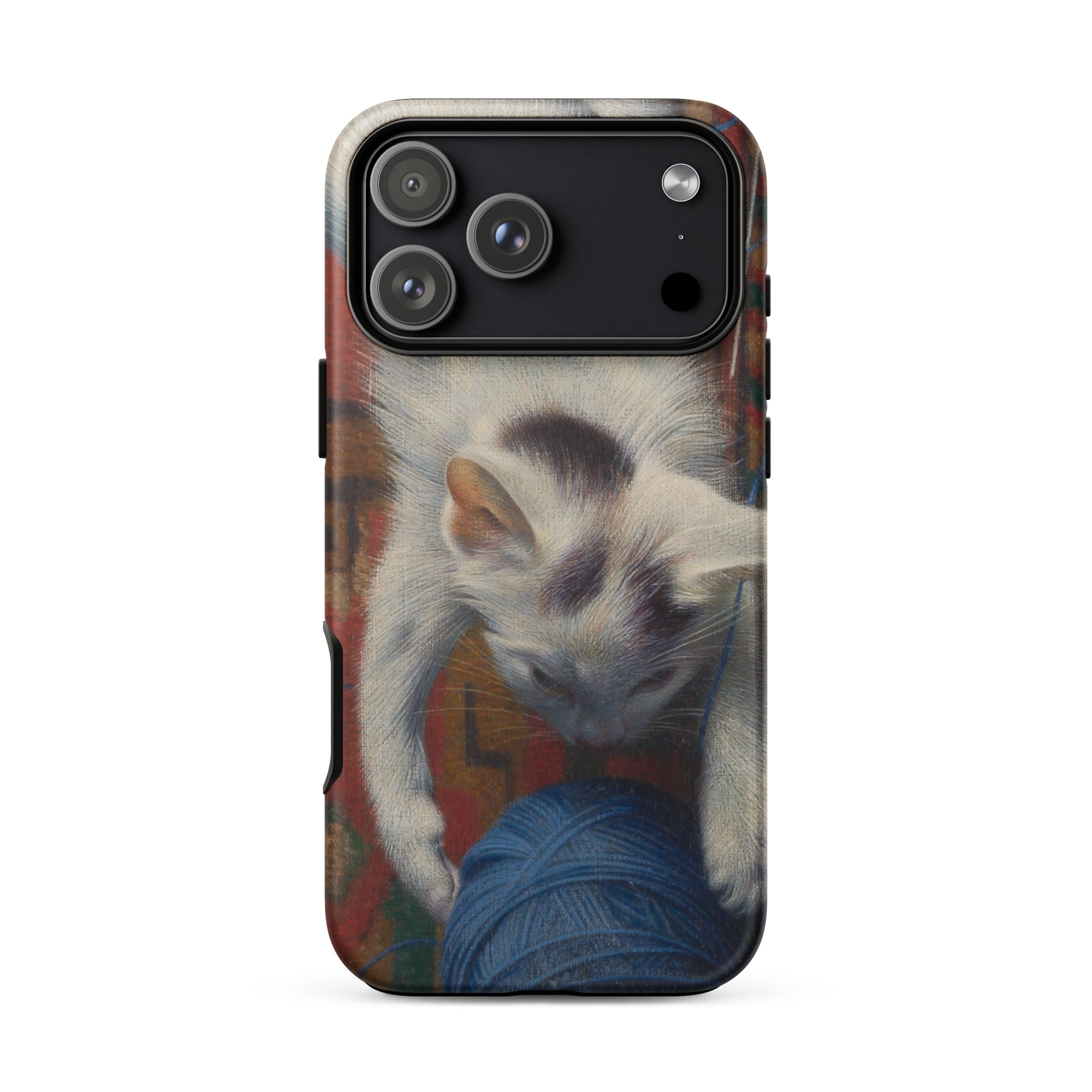 Esta funda de iPhone preserva el momento antes de desenredarse: cuando el impulso se congela en iconografía. La precisión realista de Müller representa cada hilo, cada sombra, con claridad devocional, capturando no ternura sino astucia. La pausa entre el instinto y la decisión, entre el suave vientre del juego y el filo agudo de la estrategia.