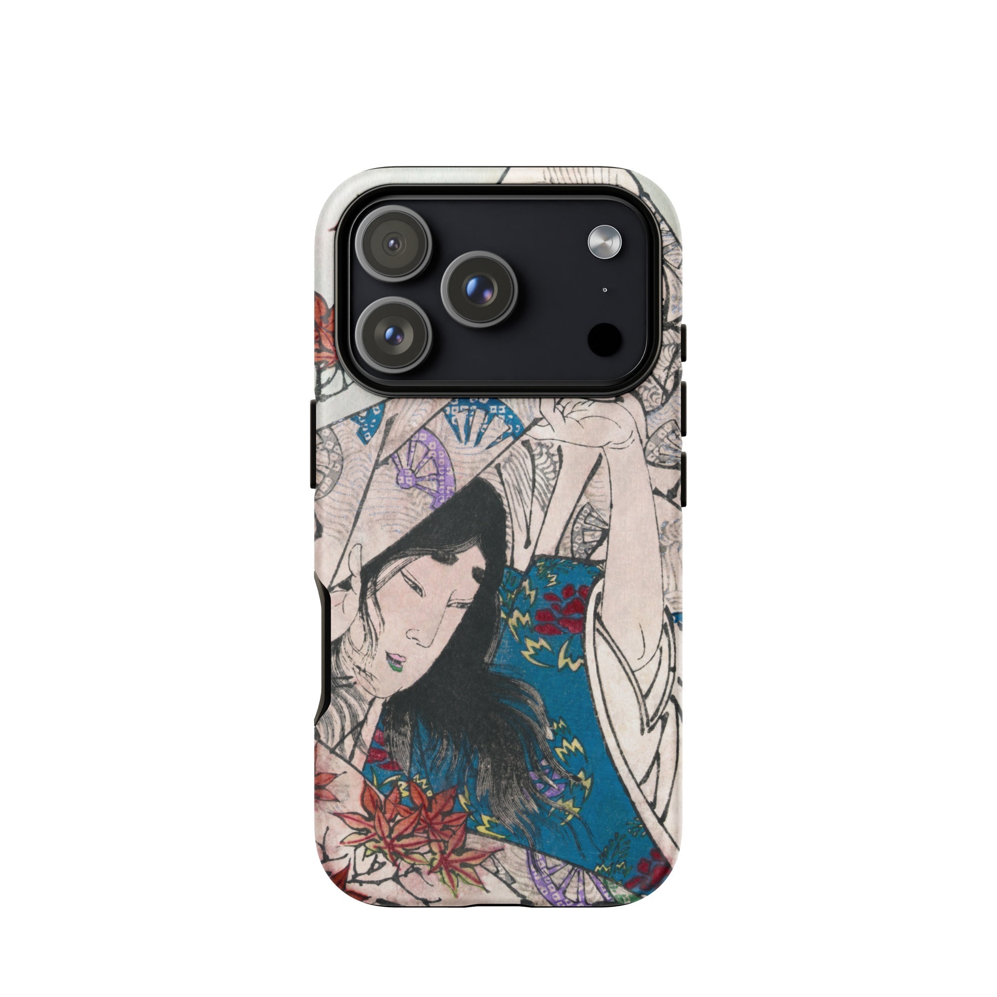 Este sueño ukiyo-e de Taiso Yoshitoshi—enredado con arce otoñal y abanicos ceremoniales—florece en tu iPhone como un susurro de la poesía de la corte Heian. Ahora este ensueño del período Edo se convierte en armadura: efímera, elegante, bordeada de mito. Protegiendo tu dispositivo dentro de una temporada de quietud, donde el flujo del tiempo se ralentiza por la tela pintada y la sombra lacada.