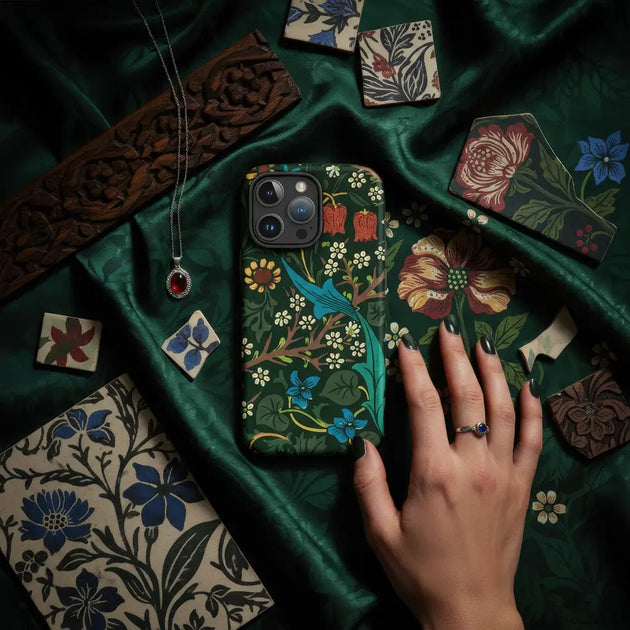 Cada mirada a esta funda de Samsung revela otro detalle: el arco emplumado del cuello del pájaro, la fina vena que traza el corazón de un pétalo, el sutil cambio de óxido a bermellón en la curva de una hoja. Esta funda convierte tu dispositivo en un panel portátil de ensueño de jardín nocturno.