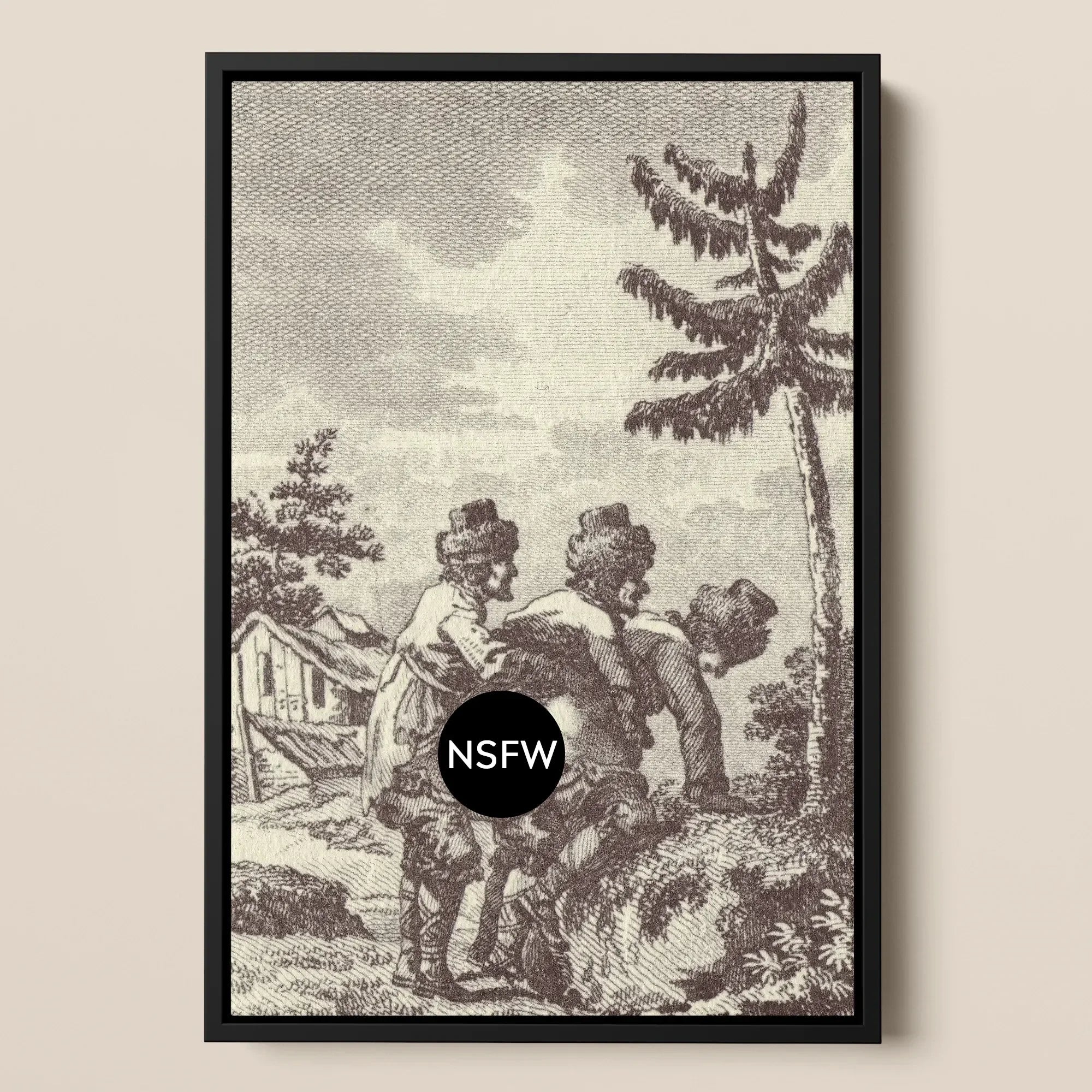 En este pastoral prohibido, el campo se convierte en teatro para la política de la carne. Tres cuerpos se entrelazan en una geometría precisa de apetito — cada línea grabada escenifica dominación, no ternura.