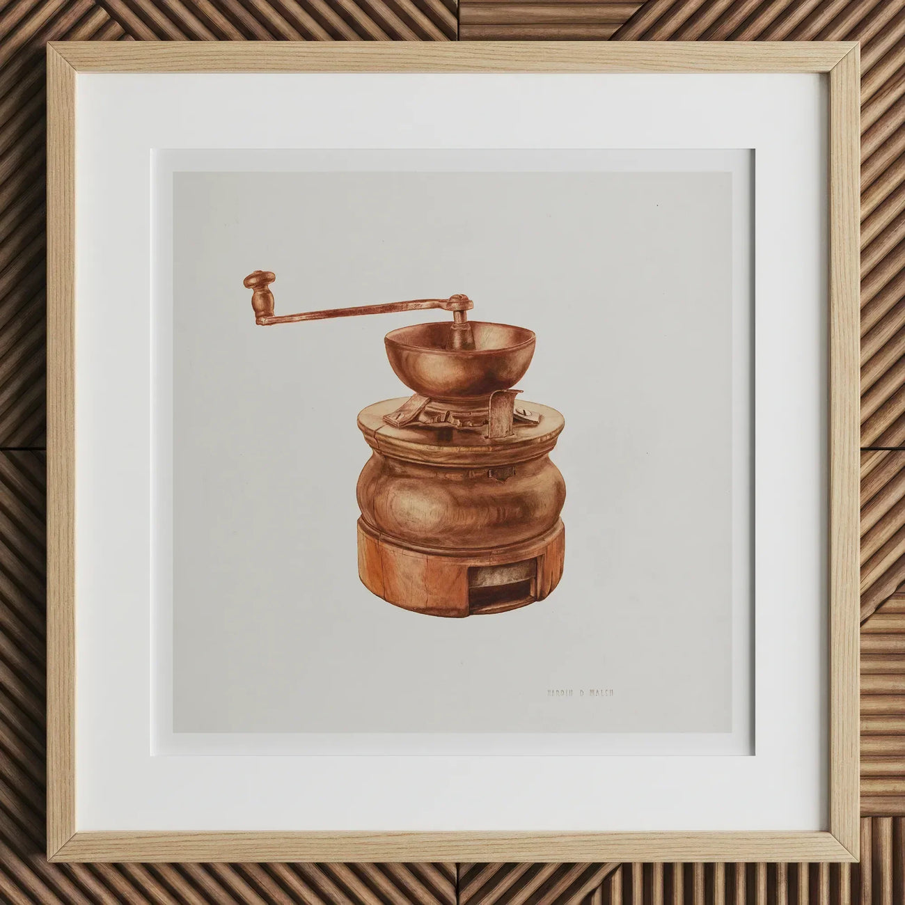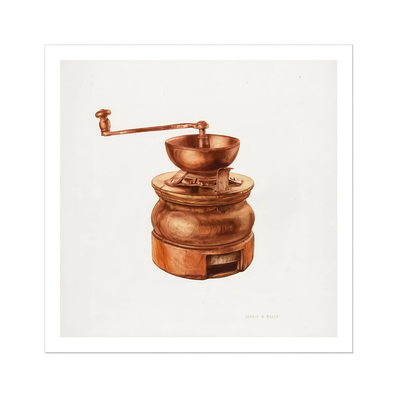 Aprovecha la nostalgia de antaño con la impresión artística del molinillo de café de los años 30 de Hardin Walsh. Esta ilustración meticulosamente elaborada muestra una maravilla de utensilios de cocina vintage con tonos cobrizos. La base cilíndrica, adornada con una sutil pátina, alberga un cajón para el botín recién molido. En la parte superior se encuentra una cúpula acanalada, coronada por un cuenco reluciente y un elegante brazo de manivela.