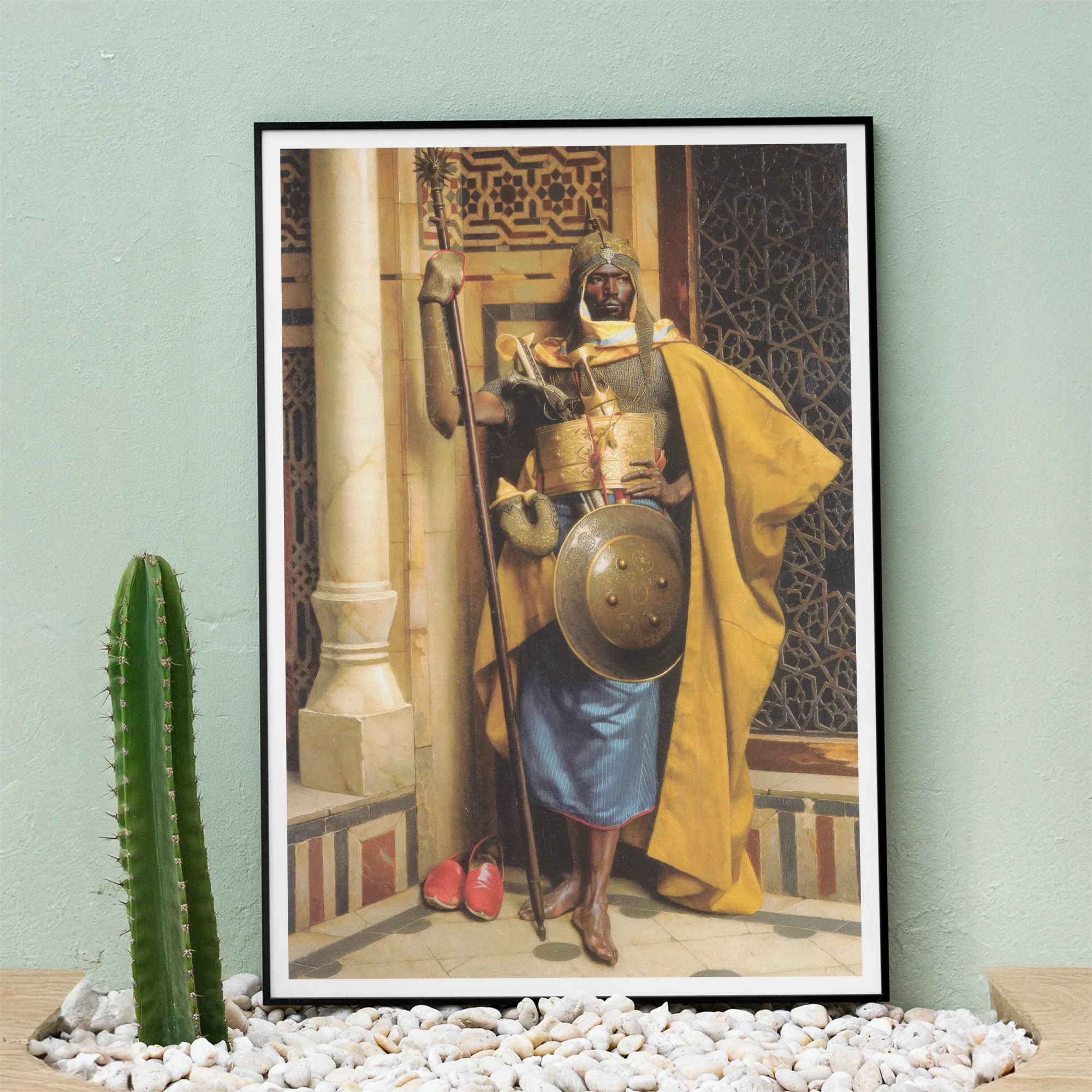 Contáctate en el atractivo mundo de Ludwig Deutsch "The Palace Guard" Art Print. Serás transportado a un palacio de El Cairo del siglo XIX, donde se encuentra un formidable vigilancia de Mamluk Sentinel. Su regalos reales y su mirada perforando respeto, que encarna siglos de herencia guerrera nubia.