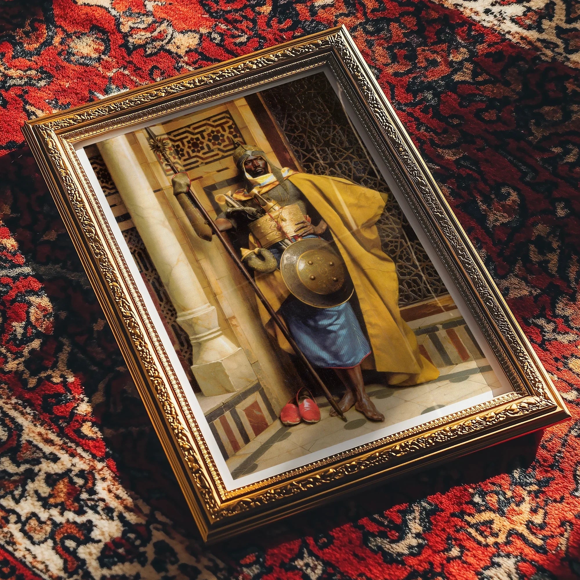 La meticulosa atención de Deutsch al detalle da vida a esta guardia. Casi puede sentir el peso de su reluciente casco indo-persa y las intrincadas texturas de sus guantes de correo. El uso magistral de luz del artista se reproduce en las ricas sedas de la capa dorada del guardia y el latón pulido de su armadura, creando una fascinante interacción de sombras y reflejos.