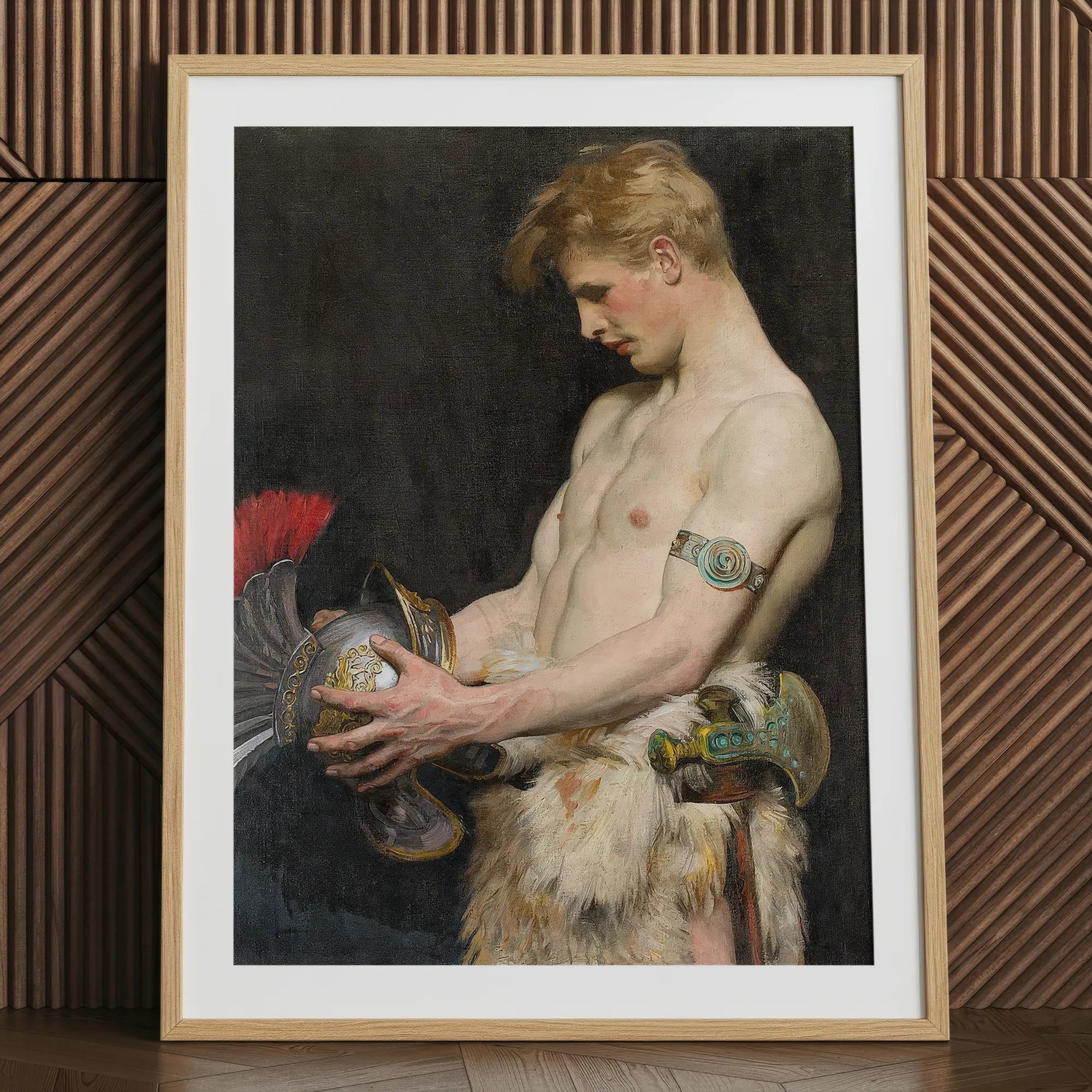 La obra maestra de 1902 de Osmar Schindler "Guerrero Germánico con Casco" epitomiza el poder bruto y la humanidad vulnerable del heroísmo clásico. Esta luminaria de la Academia de Dresde fusiona la pincelada impresionista con las formas sinuosas del Art Nouveau, creando una figura tanto monumental como íntima.