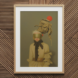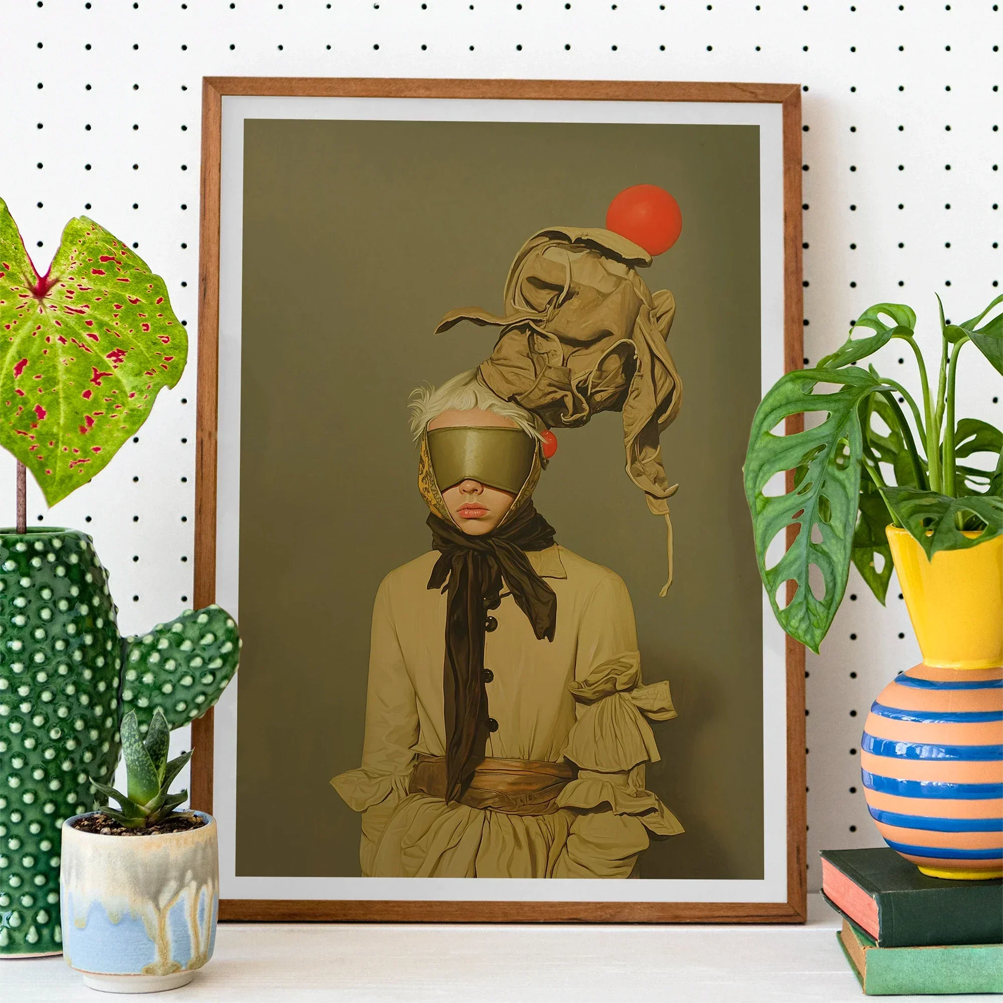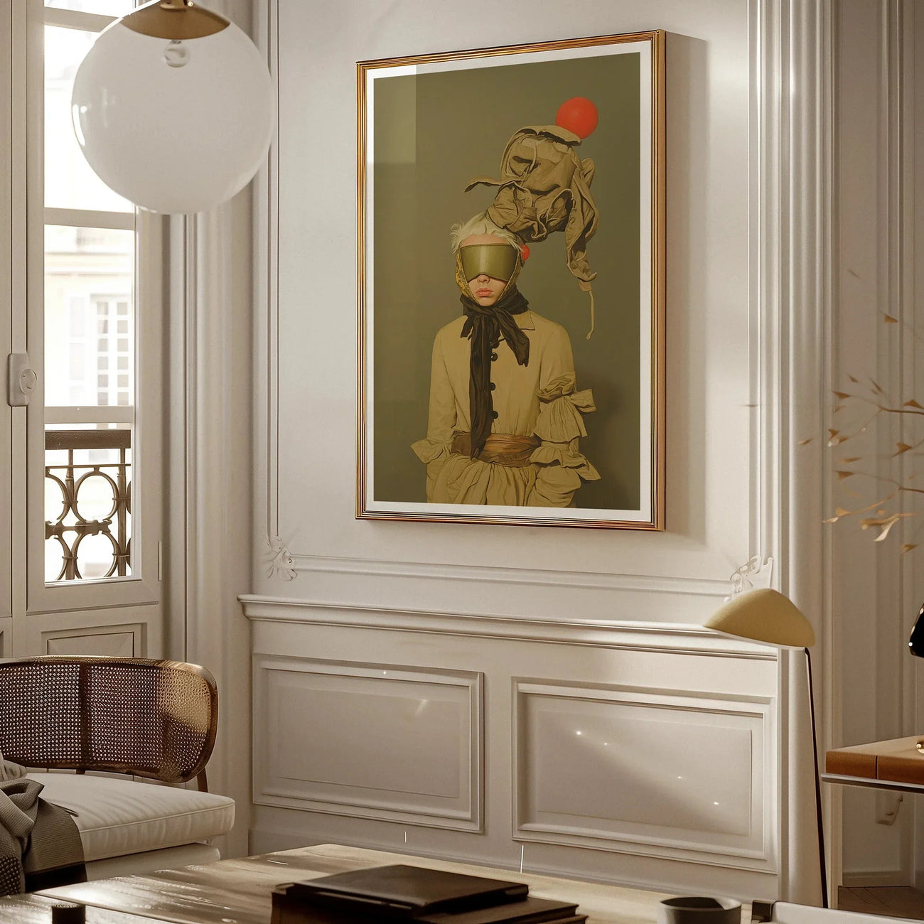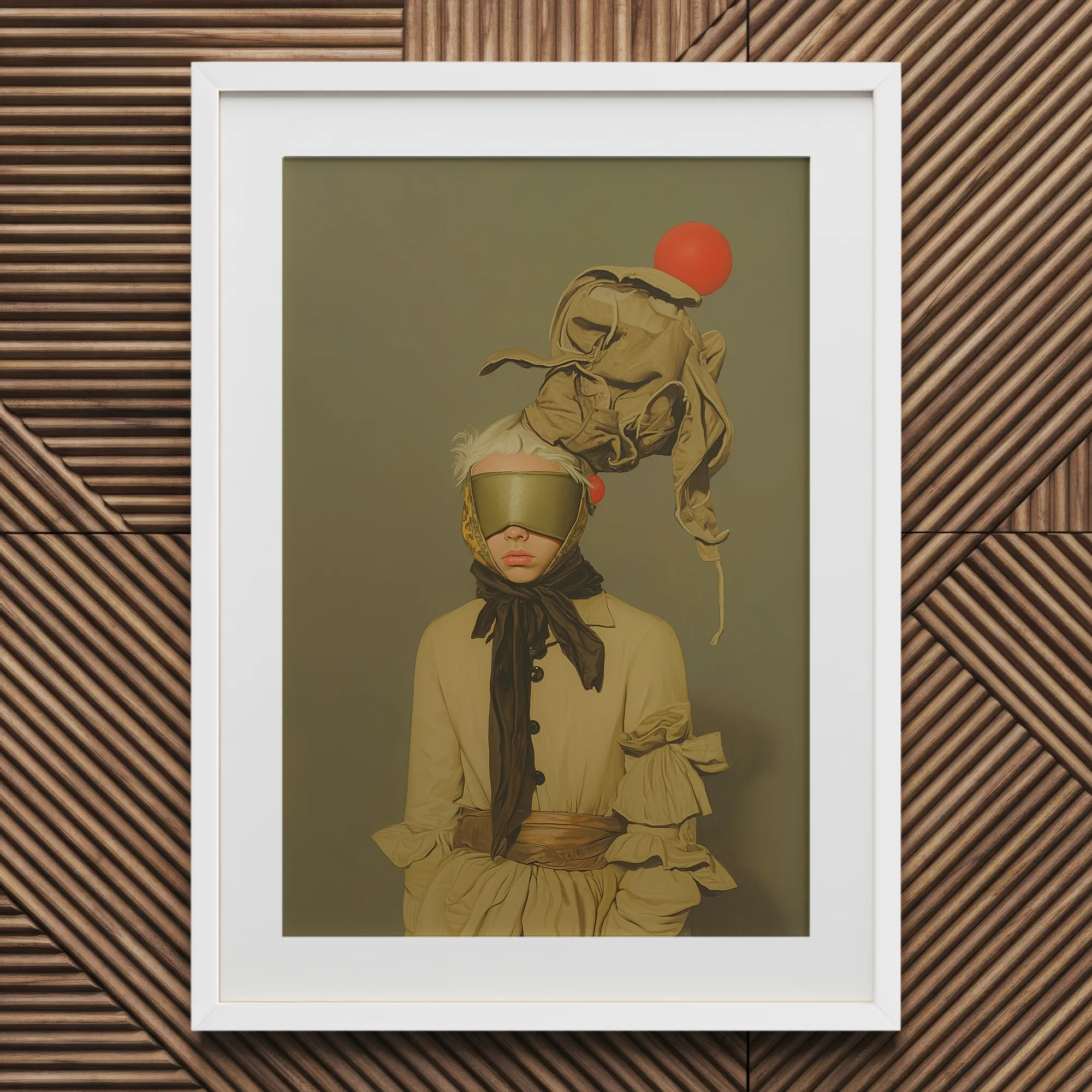 Esto es más que un retrato; es una interrogación de la identidad a través de la moda surrealista de alto concepto. El anonimato de la figura recuerda a la fotografía editorial vanguardista, donde la forma humana es un lienzo para el estilo conceptual. La esfera flotante oscila entre lo absurdo y lo divino, un motivo arrancado del léxico de los visionarios, un emblema de la constante coqueteo de la alta costura vanguardista con lo inquietante.