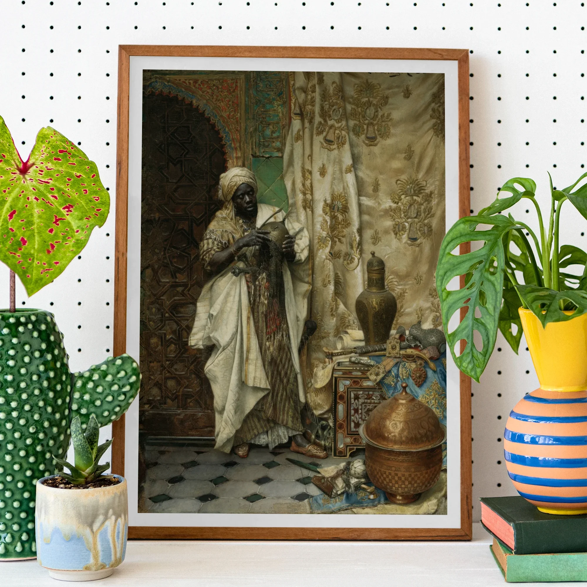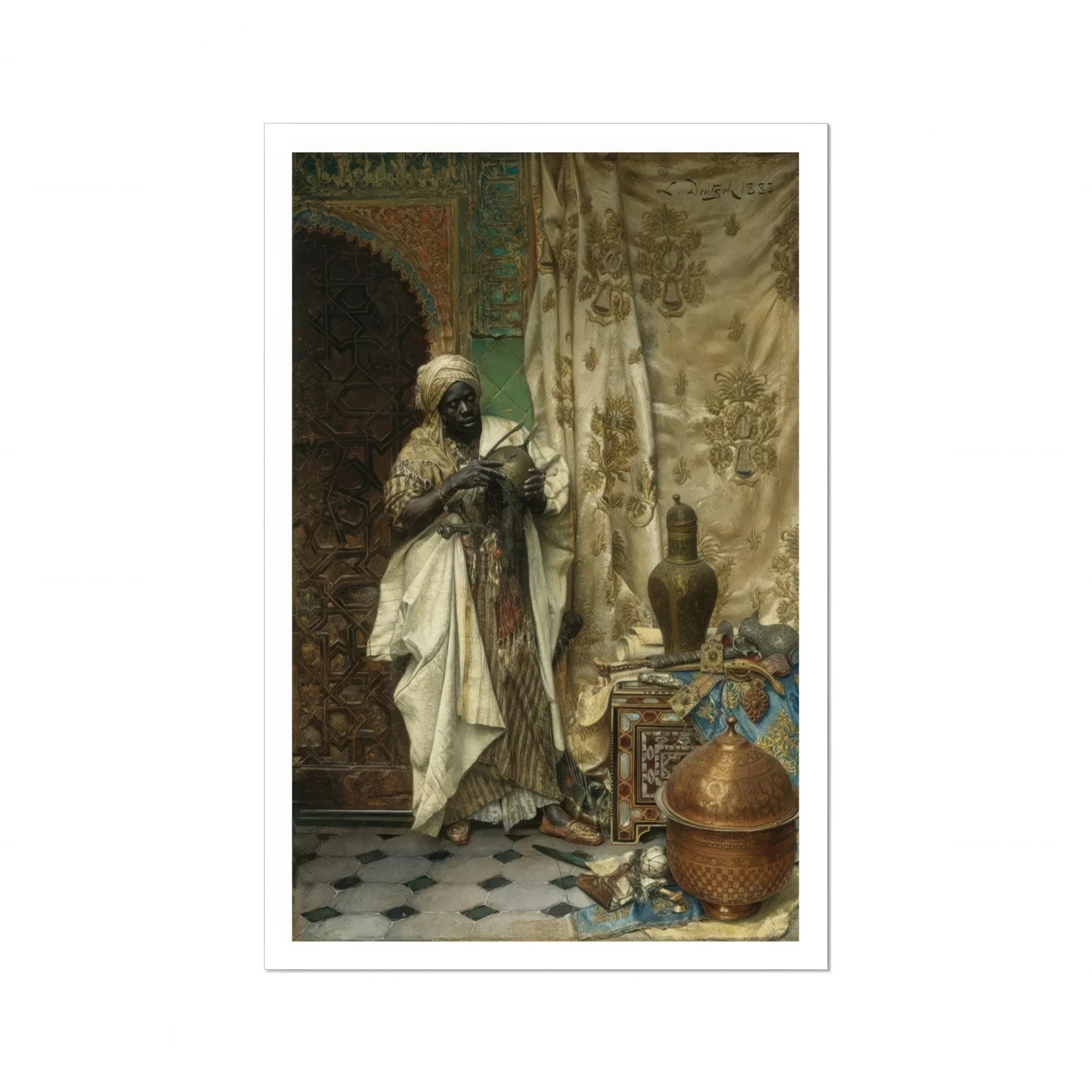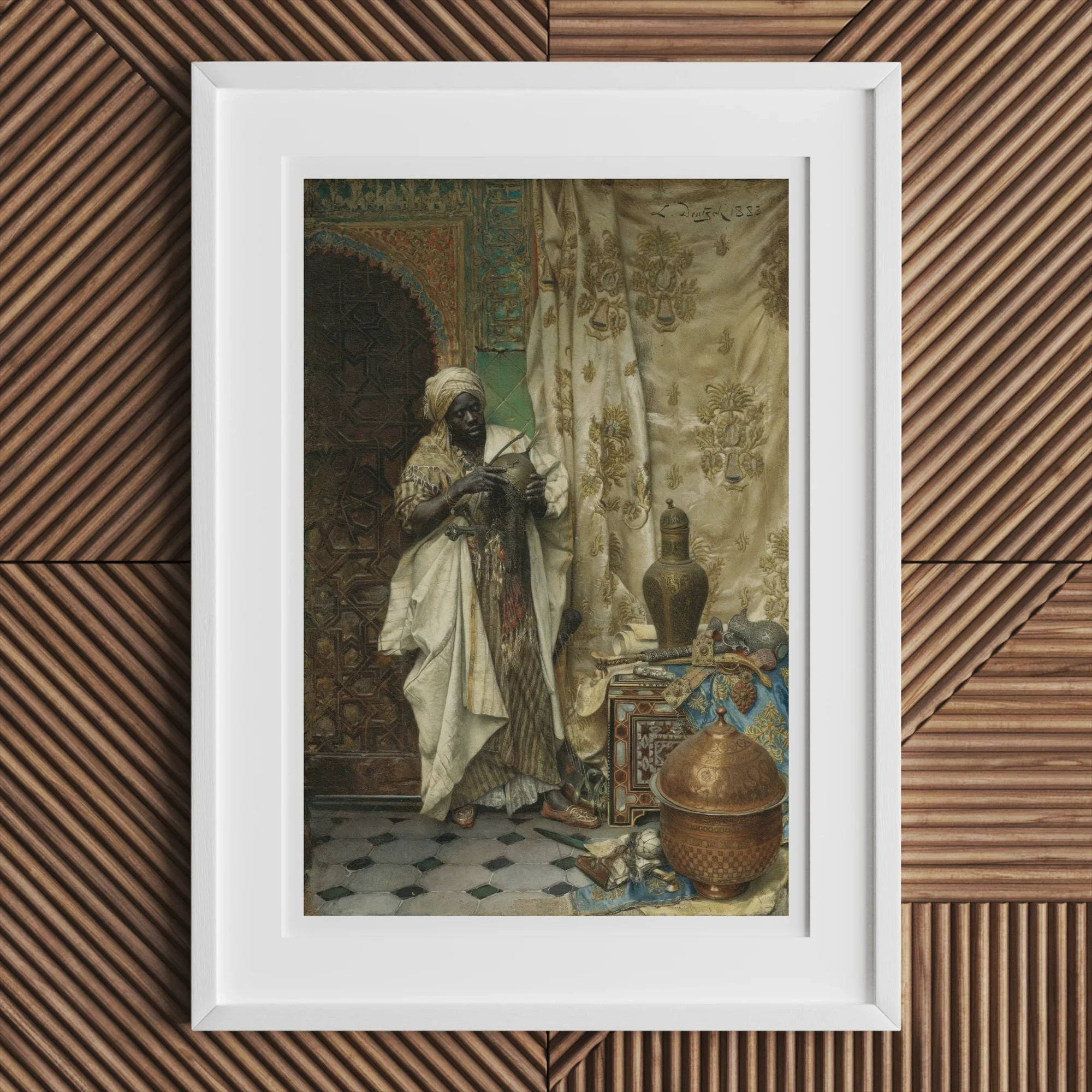 Sumerge en el opulento mundo de "La Inspección" de Ludwig Deutsch, donde cada pincelada te transporta a un lujoso interior de El Cairo del siglo XIX. Esta impresión de arte captura un momento hipnotizante mientras una figura con turbante, envuelta en un kaftán a rayas, examina un casco ornamentado en medio de un tesoro de artefactos orientales.