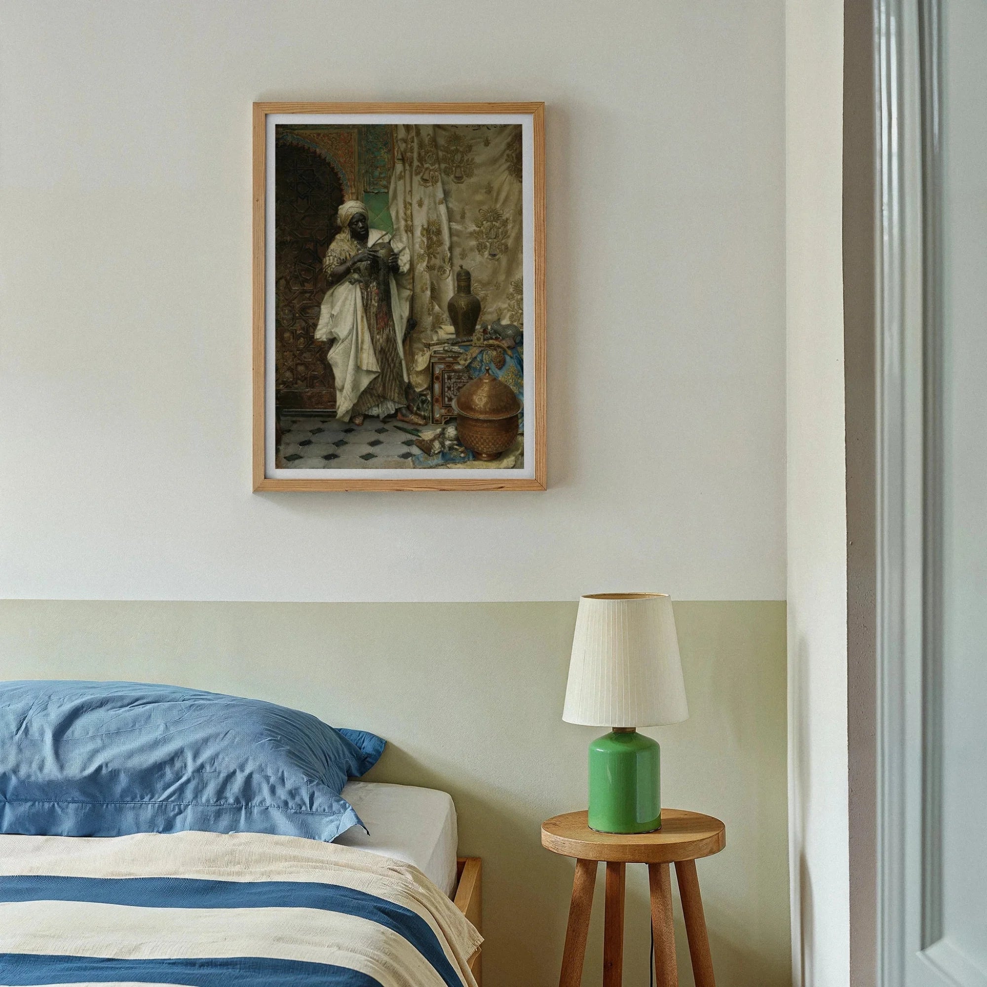 Te cautivarán las suntuosas texturas que Deutsch representa con maestría – desde la reluciente mesa de nácar hasta la exuberante cortina de brocado adornada con motivos de palmeras. El agudo ojo del artista para el detalle da vida a una variedad de armamento ostentoso: armas otomanas metidas en una faja, una espada yatagán curva, e incluso un sutil arpa de arco anidada junto a unas zapatillas bordadas.