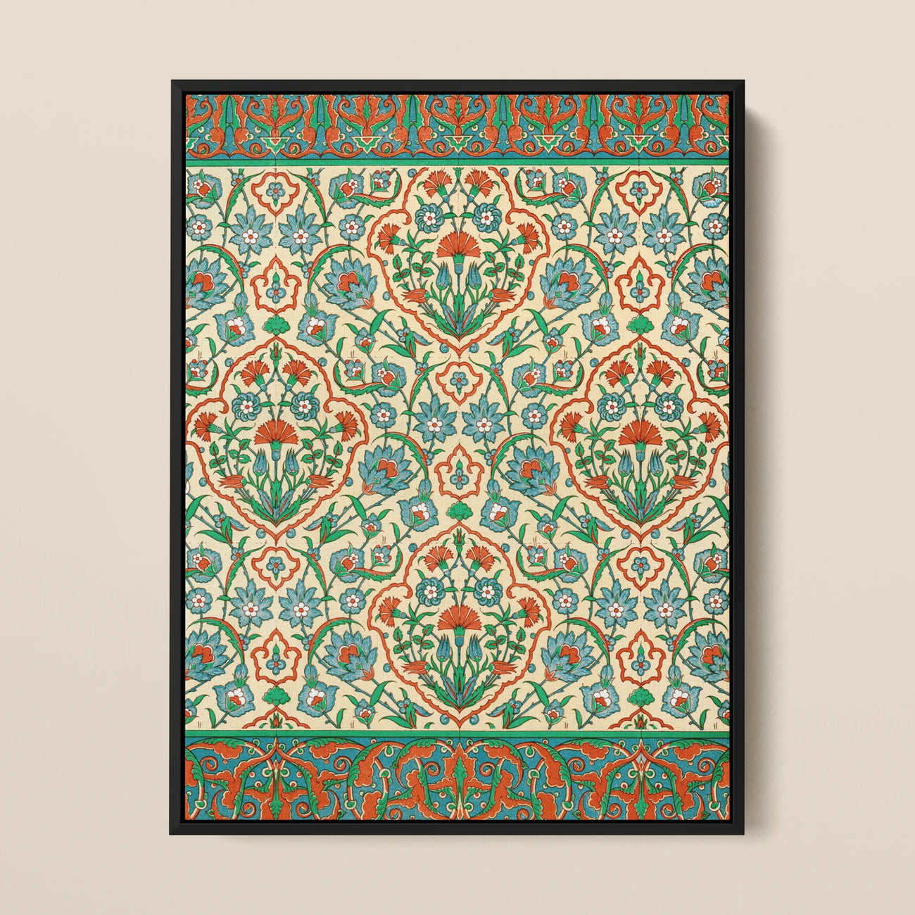 El lienzo estalla con vida, mostrando una sinfonía de lotos azules y claveles de bermellones bailando en un campo de marfil. Las vides esmeraldas tejen arabescos intrincados, simbolizando la naturaleza infinita de la creación divina. Y las fronteras vibrantes, que recuerdan a los manuscritos del Corán iluminado, enmarcan este paraíso botánico.