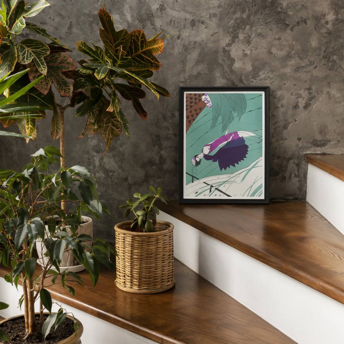 Las líneas de inspiración cubista de Martin forjan una escena de una exquisita melancolía, una figura reclinable en fucsia vibrante y morado profundo, extendido por un mar de verde azulado. Las formas angulares y los contrastes de color audaz personifican la revolución artística de los años veinte. Encontrarás tu mirada atraída por las misteriosas flores blancas que se asoman desde arriba, un símbolo de esperanza en medio de la intensidad emocional del cuadro.
