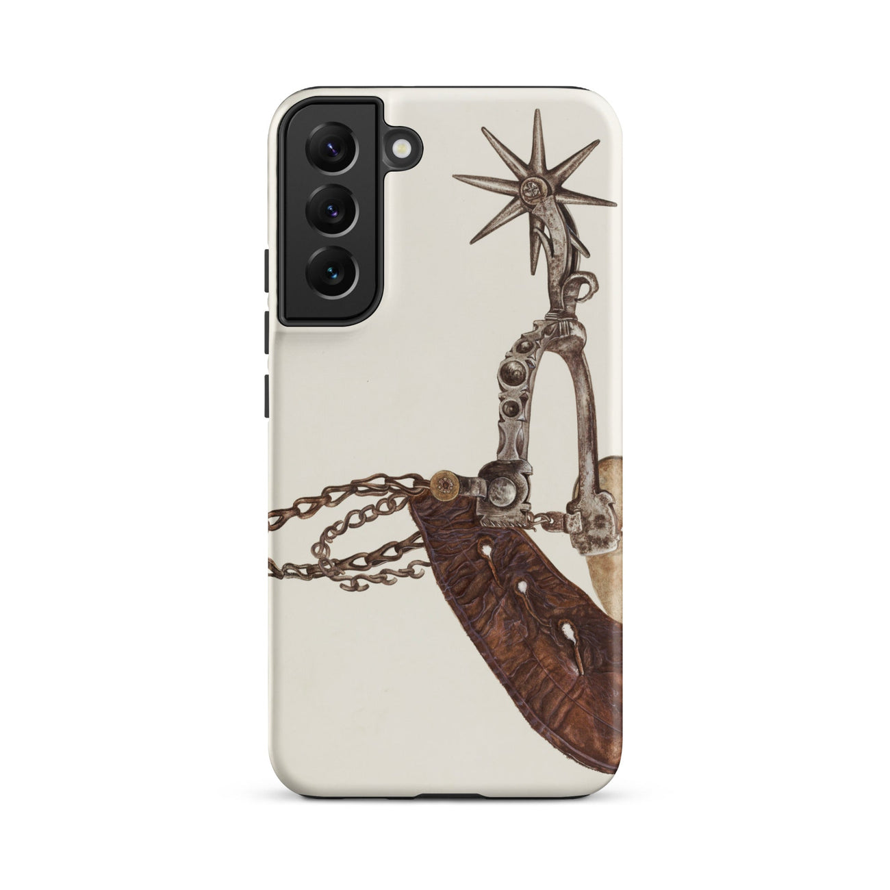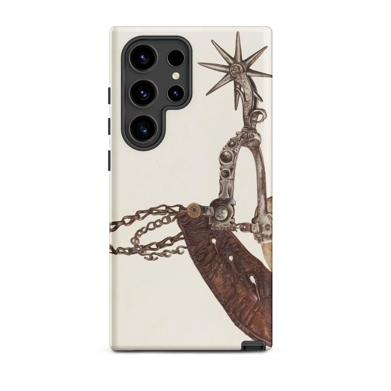 El Leather Spur de Vera van Voris de los años 1930 graba la aspereza del Oeste Americano en metal bruñido y cuero desgastado. Este estuche de Samsung enmarca los dientes en forma de estrella del ruedo pulido, los pliegues flexibles del cuero trabajado a mano y la caída deliberada de la cadena con una precisión aguda y archivística.