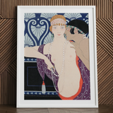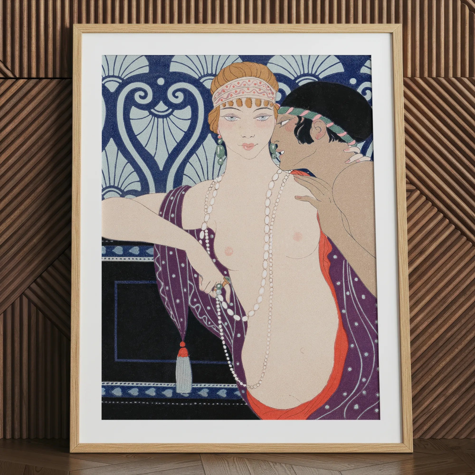 Esta impresión, parte de "Les Chansons De Bilitis," ejemplifica la habilidad inigualable de Barbier para capturar el espíritu de la alta costura de los años 20. Cada detalle meticuloso – desde las delicadas cintas para la cabeza hasta las telas fluidas – habla de la decadencia y la liberación sexual de la época. Exhibida en la Biblioteca Beinecke, esta ilustración sigue encantando a los amantes del arte y a los entusiastas de la moda por igual, ofreciendo una ventana a una era pasada de glamour e innovación artística.