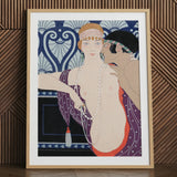 Siente la palpable intimidad mientras una figura susurra seductoramente a otra, sus cuerpos entrelazados contra un fondo de motivos Art Nouveau en espiral. La belleza central te mira con ojos conocedores, su piel de alabastro contrasta exquisitamente con el rico púrpura de su revelador vestido.
