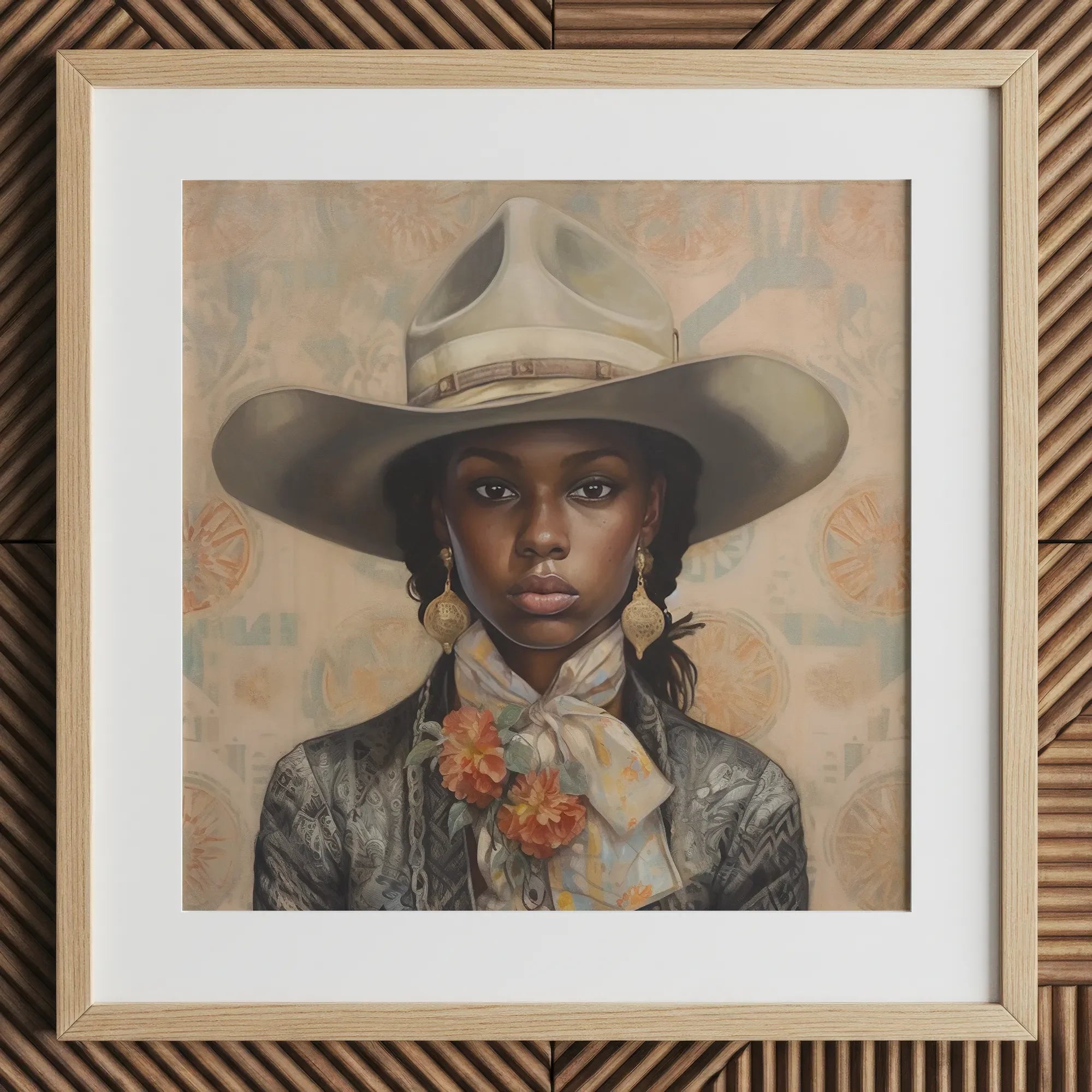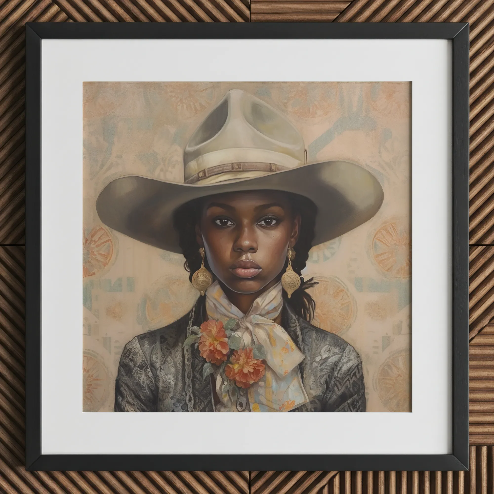 La inclinación de su Stetson es un desafío no dicho. Su chaqueta ajustada, con un patrón que resuena en el trabajo de cuentas Yoruba, lleva el peso de la ascendencia, cada puntada un himno de resiliencia. Los pendientes de filigrana dorada reflejan historias de artesanos en el Black Wall Street de Tulsa cuyas manos moldearon sueños de metal y llama. Y alrededor de su cuello, un pañuelo de seda respira con historia—sus motivos florales entrelazan los bosques de magnolias de Mississippi, los resistentes bluebonnets de Texas y los tonos dorados de los campos de caña de azúcar de Luisiana. Cada hilo es un mapa, trazando el viaje de los colonos negros que convirtieron tierras hostiles en santuarios.