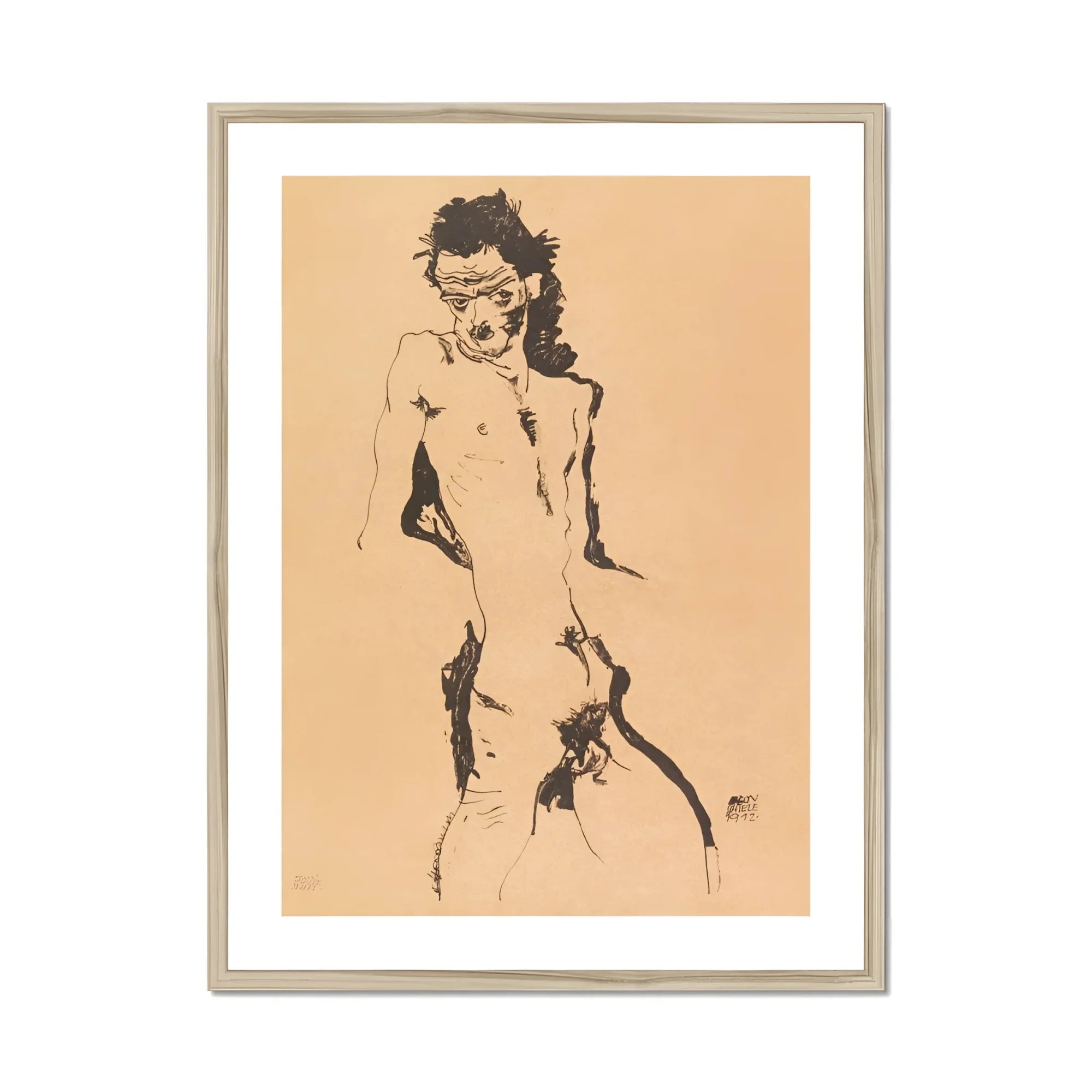 Su mirada se desvía hacia un lado, no tímida sino cargada, los labios retenidos en un aliento suspendido. Cada extremidad esforzándose hacia la tensión: muñeca flexionándose, hombro tensándose, pie curvándose. Esto no es un estudio. Es un ritual de exhibición. Schiele representa el cuerpo masculino como una ofrenda: tenso, hambriento, despojado de metáfora, rico en carga visual. Ningún símbolo reemplaza la piel. La piel es el símbolo.