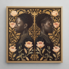 Hay una elegancia aquí—un poder tranquilo e inquebrantable. Este retrato afro-victoriano teje arte del Renacimiento Negro con inspiración Art Nouveau. su diseño floral ornamental entrelazado con impresión de filigrana dorada. Delicados grabados botánicos se curvan a su alrededor como el guion del destino, una ilustración de inspiración antigua hecha urgente y nueva.